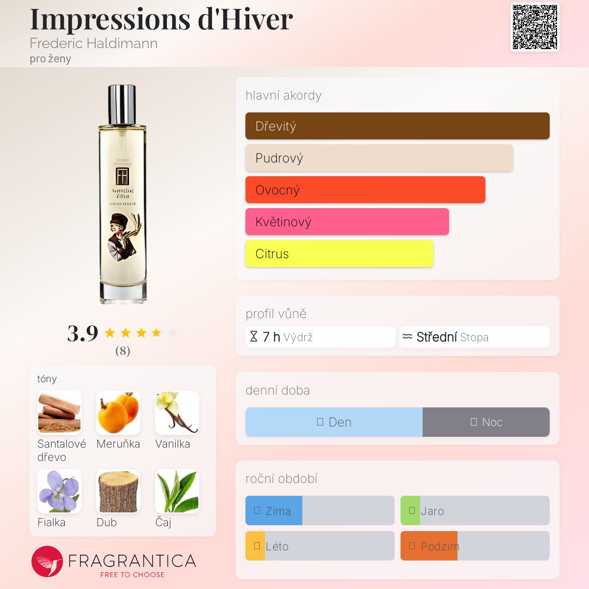 Impressions d'Hiver podle Frederic Haldimann je Floral Woody Musk vůně pro ženy. "Nosem" za touto vůní je Frederic Haldimann. Vrchní tóny jsou Černý rybíz, Kalábrijský bergamot a Italská mandarinka; střední tóny jsouFialka, Růže, Frézie a Jasmín ; základní tóny jsou Santalové dřevo, Meruňka, Bourbonská vanilka, Dub, Černý čaj darjeeling, Broskev, Brazilské růžové dřevo a Pižmo.