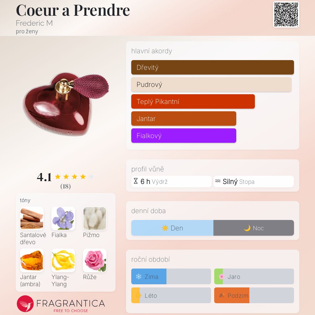 Coeur a Prendre podle Frederic M je Floral Woody Musk vůně pro ženy. "Nosem" za touto vůní je Frederic Munoz. Vrchní tón je Bergamot ; střední tóny jsouFialka, Ylang-Ylang, Růže a Hřebíček ; základní tóny jsou Santalové dřevo, Pižmo a Jantar (ambra).