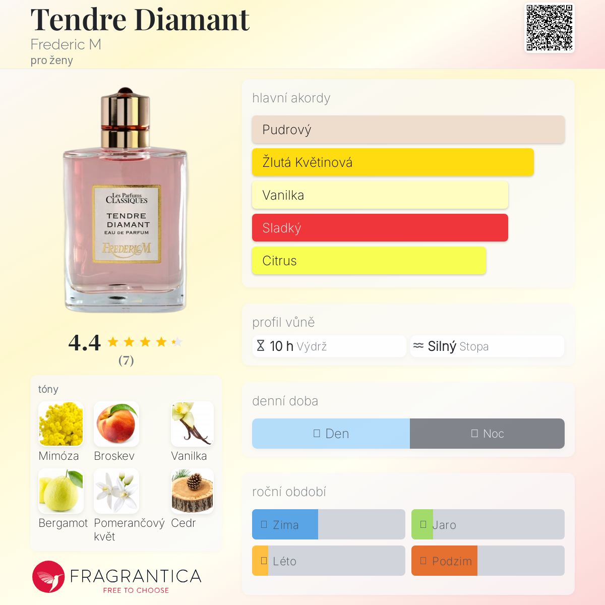 Tendre Diamant podle Frederic M je Floral Fruity vůně pro ženy. "Nosem" za touto vůní je Frederic Munoz. Vrchní tóny jsou Broskev a Bergamot; střední tóny jsouMimóza a Pomerančový květ ; základní tóny jsou Vanilka a Cedr.