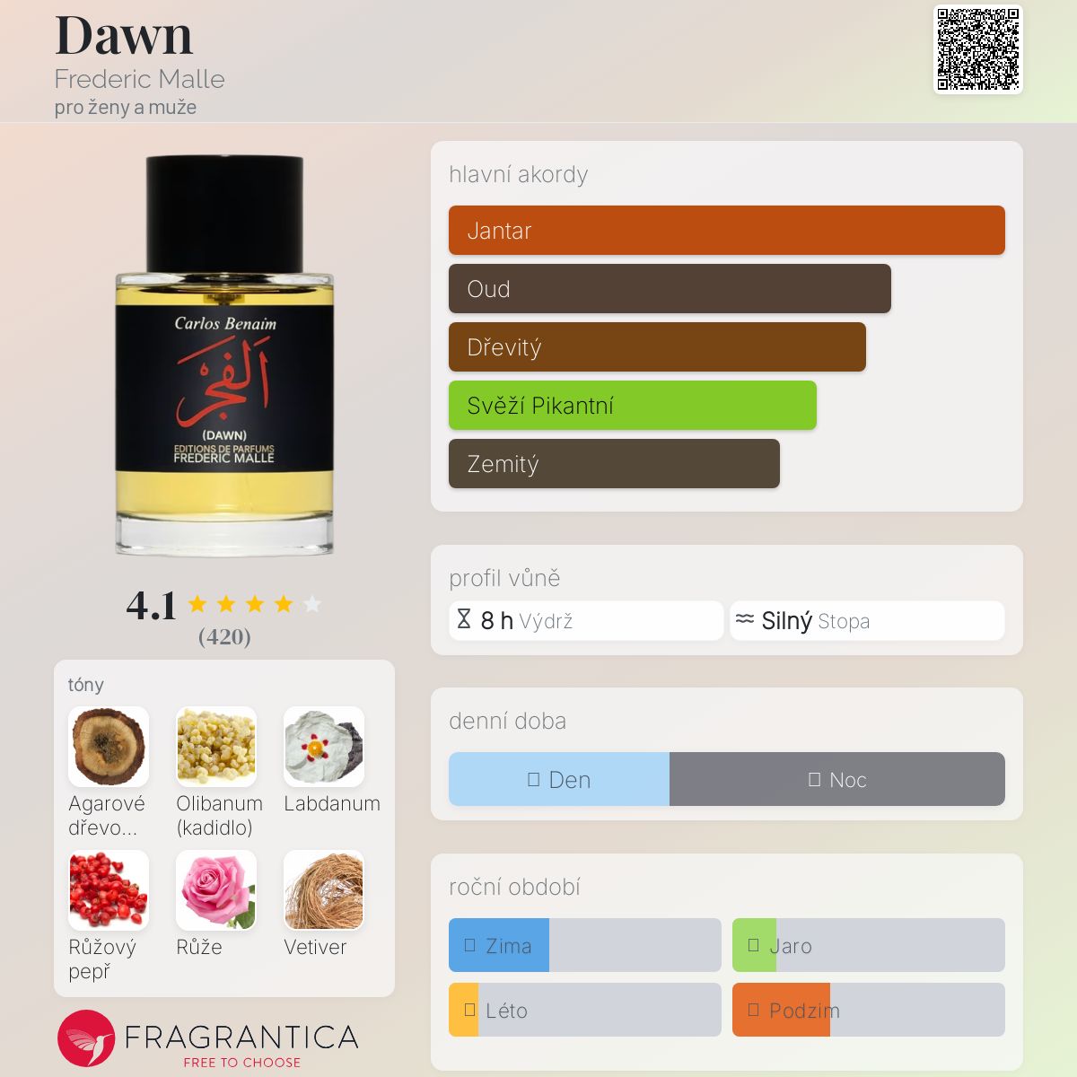 Dawn podle Frederic Malle je Orientální Woody vůně pro ženy a muže. Dawn byl/a uveden/a v roce 2018. "Nosem" za touto vůní je Carlos Benaïm. Vrchní tóny jsou Růžový pepř a Turecká růže; střední tóny jsouOlibanum, Turecká růže a Jantar (ambra) ; základní tóny jsou Agarové dřevo (oud), Labdanum, Vetiver, Dubový mech, Cedr a Ambroxan.