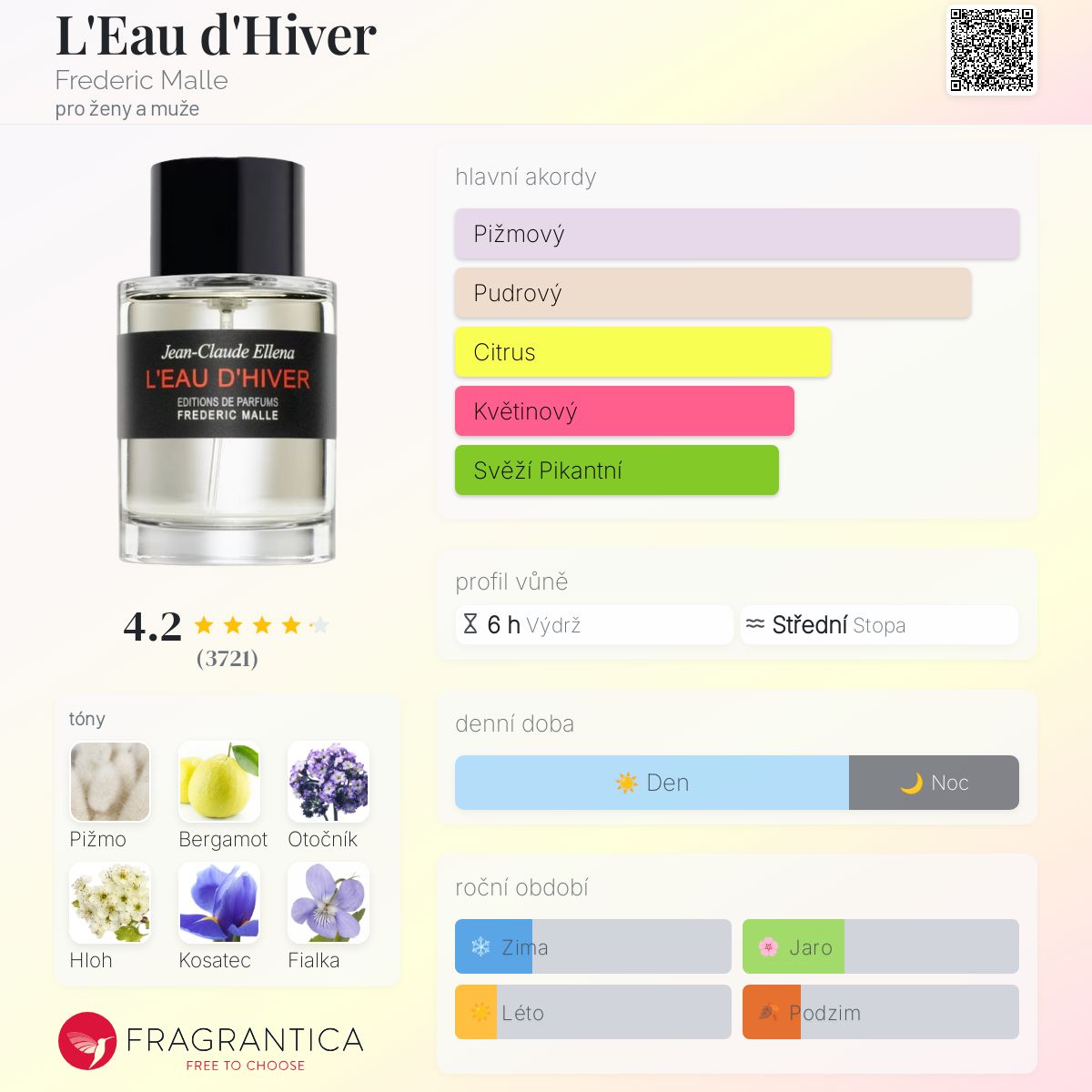 L'Eau d'Hiver podle Frederic Malle je Floral Woody Musk vůně pro ženy a muže. L'Eau d'Hiver byl/a uveden/a v roce 2003. "Nosem" za touto vůní je Jean-Claude Ellena. Vrchní tóny jsou Bergamot, Zelené tóny, Růžový pepř, Citrón, Puškvorec obecný a Grapefruit; střední tóny jsouOtočník, Hloh, Kosatec, Fialka, Med, Konvalinka, Jasmín, Pomerančový květ, Růže a Ylang-Ylang ; základní tóny jsou Bílé pižmo, Andělika, Seno, Santalové dřevo, Cedr, Fazole tonka, Benzoin a Jantar (ambra).