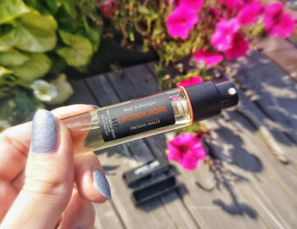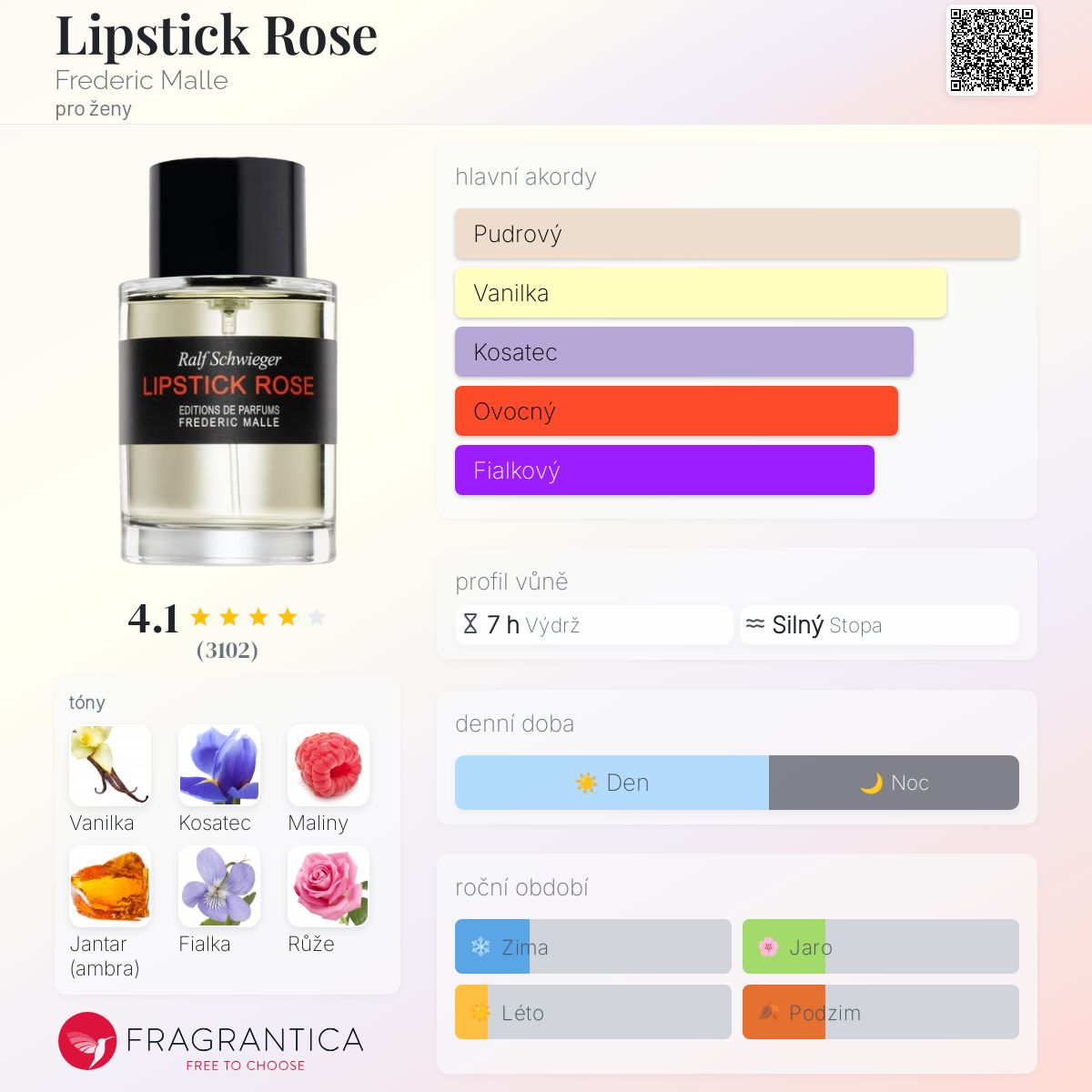 Lipstick Rose podle Frederic Malle je Floral vůně pro ženy. Lipstick Rose byl/a uveden/a v roce 2000. "Nosem" za touto vůní je Ralf Schwieger. Vrchní tóny jsou Maliny, Liči, Zelené tóny, Grapefruit, Galbanum, Citrón a Bergamot; střední tóny jsouKosatec, Fialka, Růže, Otočník, Konvalinka a Hřebíček ; základní tóny jsou Vanilka, Jantar (ambra), Bílé pižmo, Pačuli, Cedr, Mech, Kůže a Vetiver.