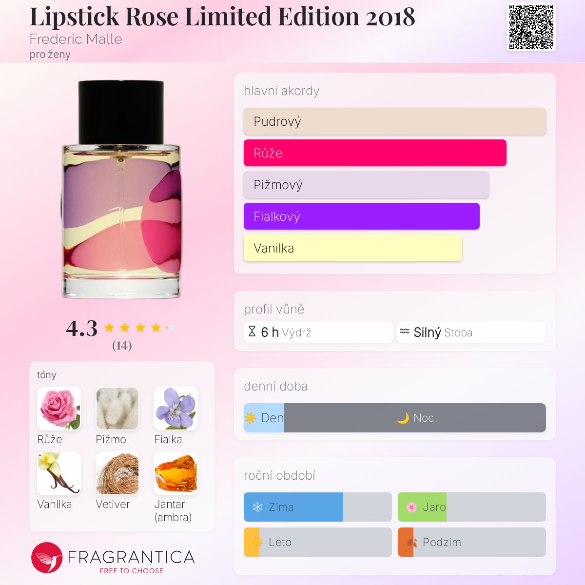 Lipstick Rose Limited Edition 2018 podle Frederic Malle je Floral vůně pro ženy. Lipstick Rose Limited Edition 2018 byl/a uveden/a v roce 2018. "Nosem" za touto vůní je Ralf Schwieger.