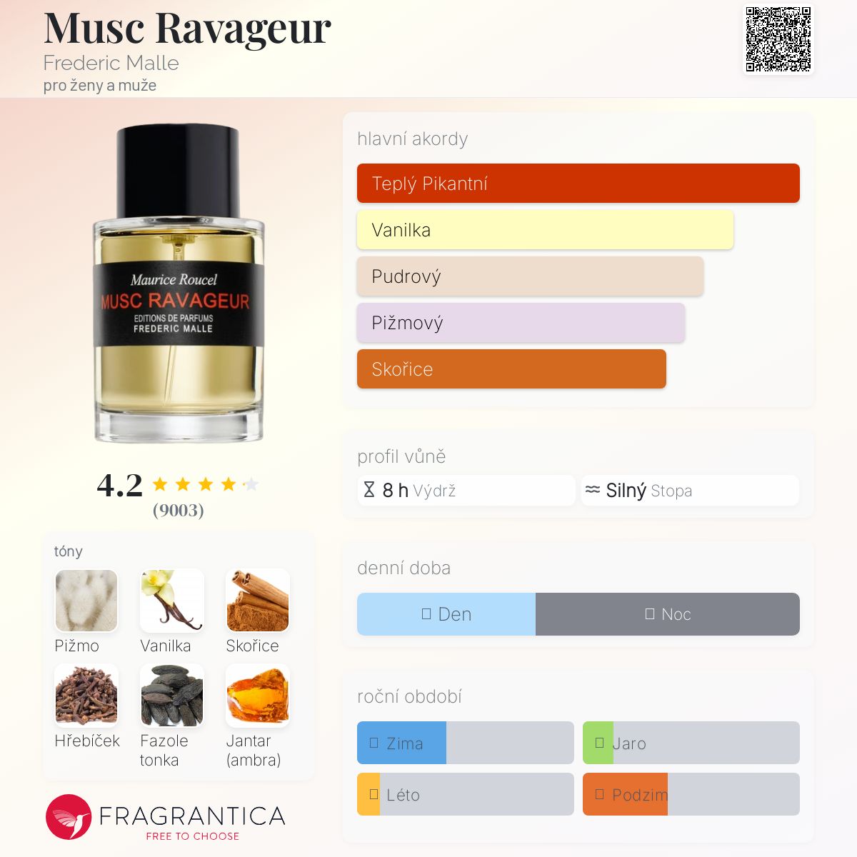 Musc Ravageur podle Frederic Malle je Orientální Spicy vůně pro ženy a muže. Musc Ravageur byl/a uveden/a v roce 2000. "Nosem" za touto vůní je Maurice Roucel. Vrchní tóny jsou Levandule, Mandarinka, Bergamot, Koriandr a Neroli; střední tóny jsouSkořice, Hřebíček, Kořen orris, Růže a Vonokvětka ; základní tóny jsou Pižmo, Vanilka, Fazole tonka, Jantar (ambra), Santalové dřevo, Guajakové dřevo, Cedr, Zvířecí tóny a Pačuli.