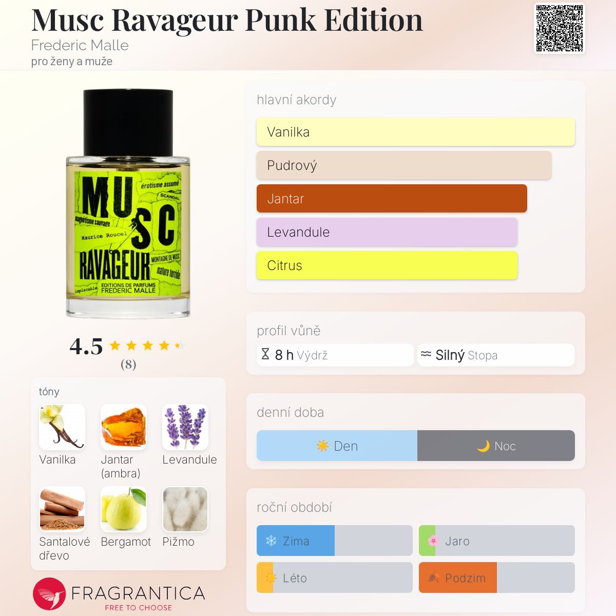 Musc Ravageur Punk Edition podle Frederic Malle je Orientální vůně pro ženy a muže. Musc Ravageur Punk Edition byl/a uveden/a v roce 2019. "Nosem" za touto vůní je Maurice Roucel. Vrchní tóny jsou Levandule, Bergamot a Mandarinka; střední tóny jsouVanilka, Jantar (ambra) a Pižmo ; základní tóny jsou Santalové dřevo a Pižmo.