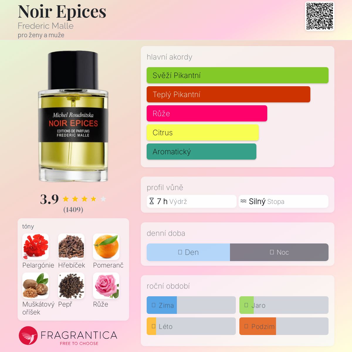 Noir Epices podle Frederic Malle je Orientální Spicy vůně pro ženy a muže. Noir Epices byl/a uveden/a v roce 2000. "Nosem" za touto vůní je Michel Roudnitska. Vrchní tóny jsou Pelargónie, Pomeranč a Růže; střední tóny jsouHřebíček, Muškátový oříšek, Pepř a Skořice ; základní tóny jsou Pačuli, Santalové dřevo, Cedr a Vanilka.