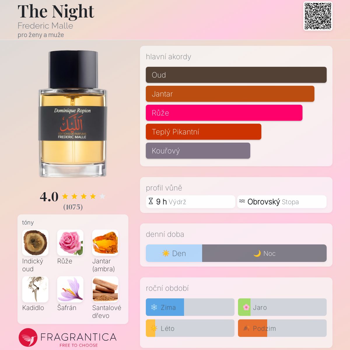 The Night podle Frederic Malle je Orientální Woody vůně pro ženy a muže. The Night byl/a uveden/a v roce 2014. "Nosem" za touto vůní je Dominique Ropion. Vrchní tóny jsou Turecká růže a Šafrán; střední tón jeIndický oud ; základní tóny jsou Jantar (ambra), Kadidlo a Santalové dřevo.