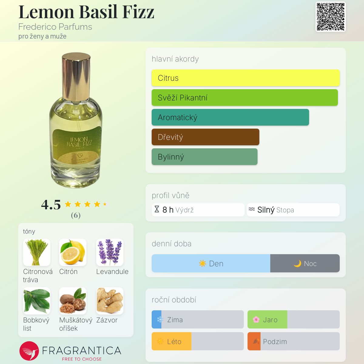 Lemon Basil Fizz podle Frederico Parfums je Citrus Aromatic vůně pro ženy a muže. Lemon Basil Fizz byl/a uveden/a v roce 2023. "Nosem" za touto vůní je Justin Frederico. Vrchní tóny jsou Citronová tráva a Citrón; střední tóny jsouLevandule, Bobkový list, Muškátový oříšek, Zázvor a Bazalka ; základní tóny jsou Červený cedr, Cypriolový olej a Mech.