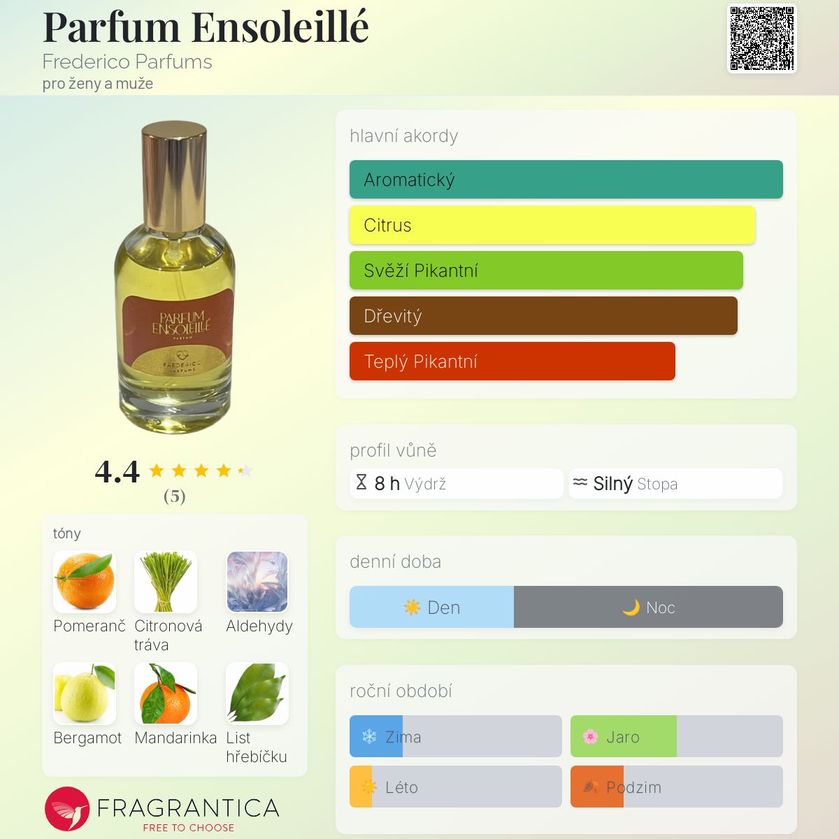 Parfum Ensoleillé podle Frederico Parfums je Orientální Floral vůně pro ženy a muže. Parfum Ensoleillé byl/a uveden/a v roce 2023. "Nosem" za touto vůní je Justin Frederico. Vrchní tóny jsou Italský pomeranč, Citronová tráva, Aldehydy, Bergamot a Mandarinka; střední tóny jsouList hřebíčku, Koriandr, Levandule, Hedione, Zázvor, Tymián, Bazalka a Kmín ; základní tóny jsou Virginský cedr, Ambrettolide, Santalové dřevo, Ambra, Vetiver, Včelí vosk, Myrha a Mech. Tento parfém je vítězem 3 ocenění: Best of Scent, Ça Fleure Bon a 2023 .