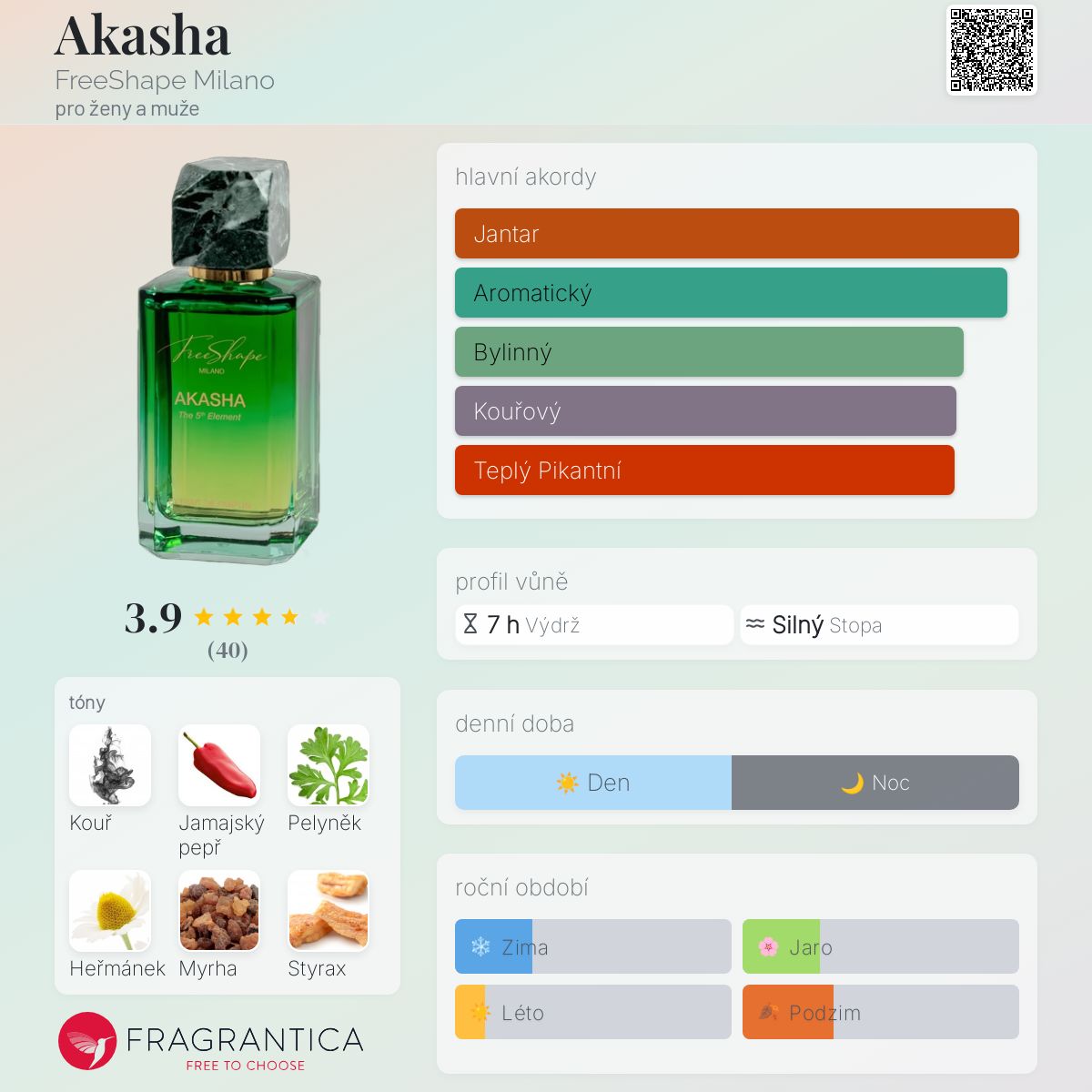 Akasha podle FreeShape Milano je Woody Aromatic vůně pro ženy a muže. Akasha byl/a uveden/a v roce 2022. "Nosem" za touto vůní je Carlo Ribero. Vrchní tóny jsou Kouř, Pelyněk, Elemi a Kalábrijský bergamot; střední tóny jsouJamajský pepř, Heřmánek, Rebarbora, Davana, Kardamom a Shiso ; základní tóny jsou Myrha, Styrax, Labdanum a Černý čaj.