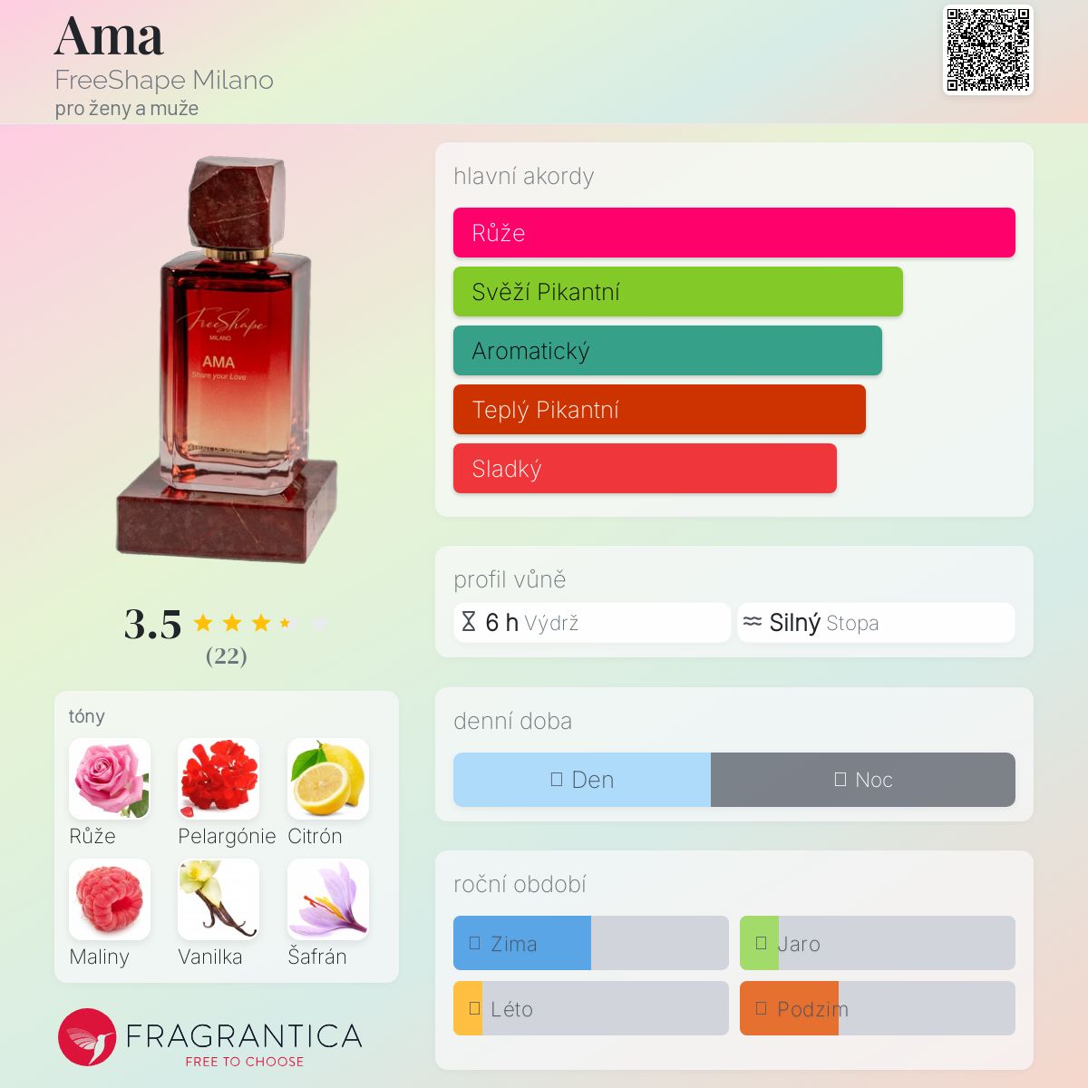 Ama podle FreeShape Milano je Orientální Floral vůně pro ženy a muže. Ama byl/a uveden/a v roce 2022. "Nosem" za touto vůní je Carlo Ribero. Vrchní tóny jsou Růže, Citrón, Maliny a Palisandr; střední tóny jsouTurecká růže, Pelargónie a Gardénie ; základní tóny jsou Vanilka, Šafrán, Agarové dřevo (oud), Pačuli, Jantar (ambra) a Hnědý cukr.