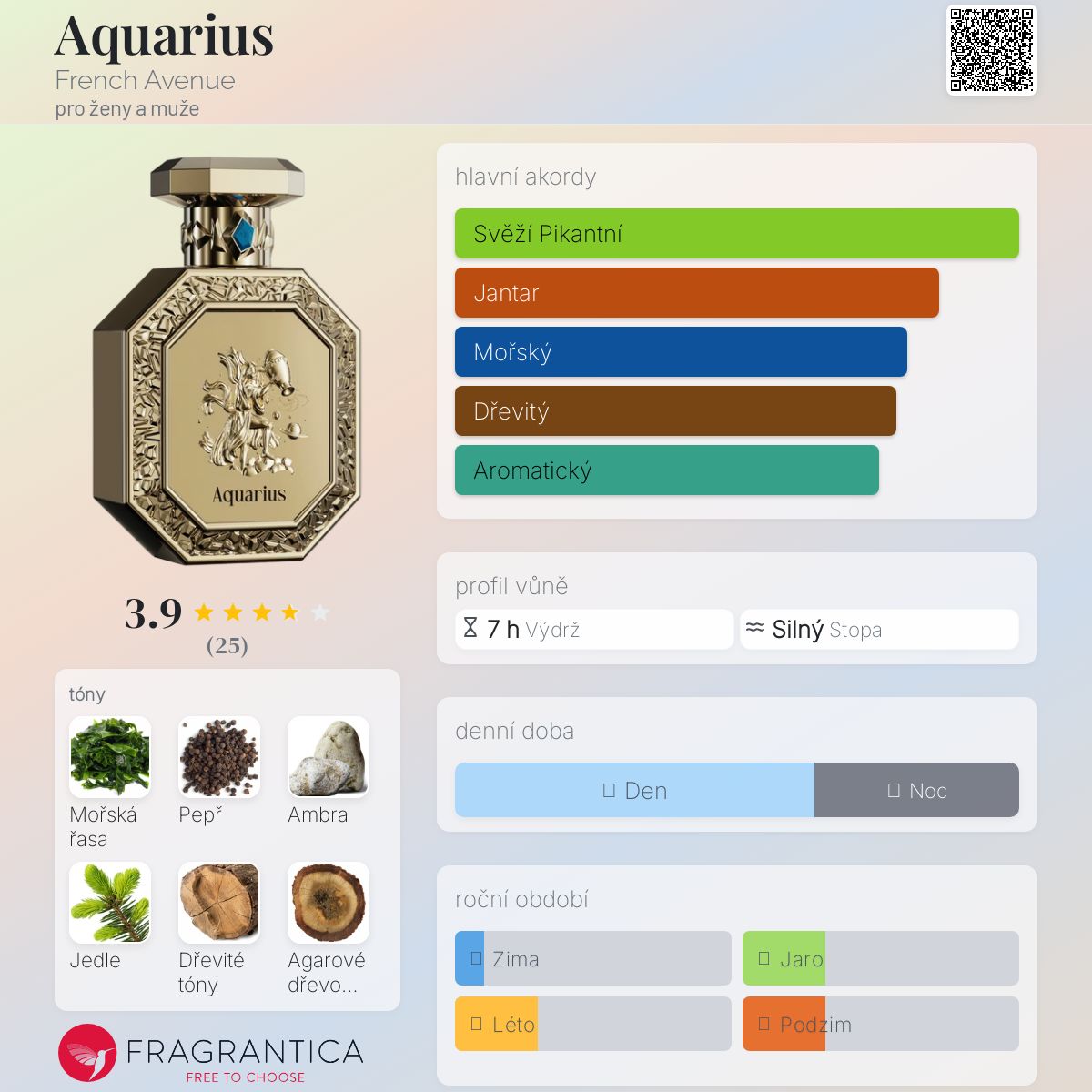 Aquarius podle French Avenue je Orientální Woody vůně pro ženy a muže. Toto je nová vůně. Aquarius byl/a uveden/a v roce 2025. "Nosem" za touto vůní je Miroslav Petkov. Vrchní tóny jsou Mořská řasa a Pepř; střední tóny jsouAmbra a Jedle balzámová ; základní tóny jsou Dřevité tóny, Agarové dřevo (oud) a Styrax.