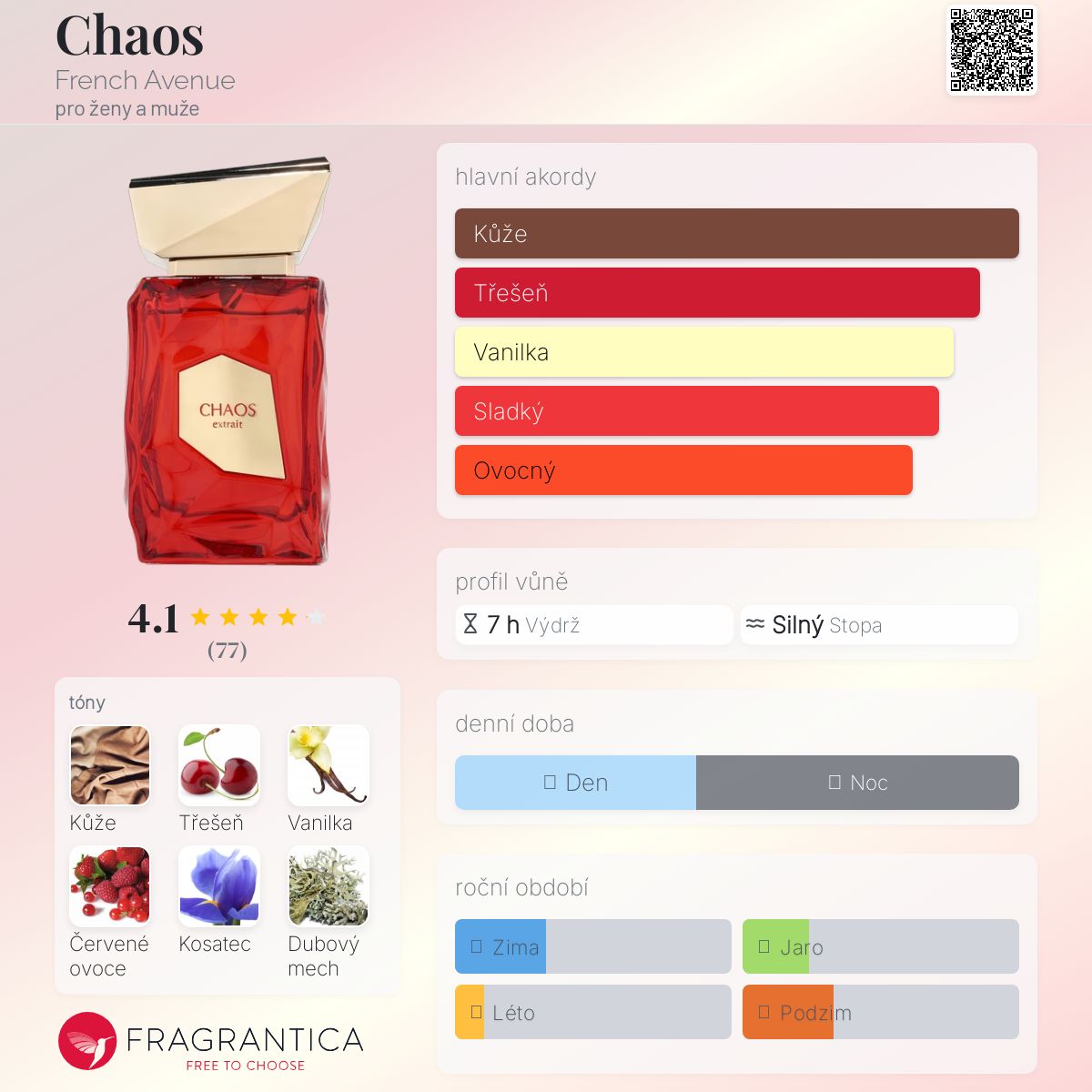 Chaos podle French Avenue je Leather vůně pro ženy a muže. Toto je nová vůně. Chaos byl/a uveden/a v roce 2025. Vrchní tóny jsou Třešeň a Červené ovoce; střední tón jeKosatec ; základní tóny jsou Kůže, Vanilka a Mech.