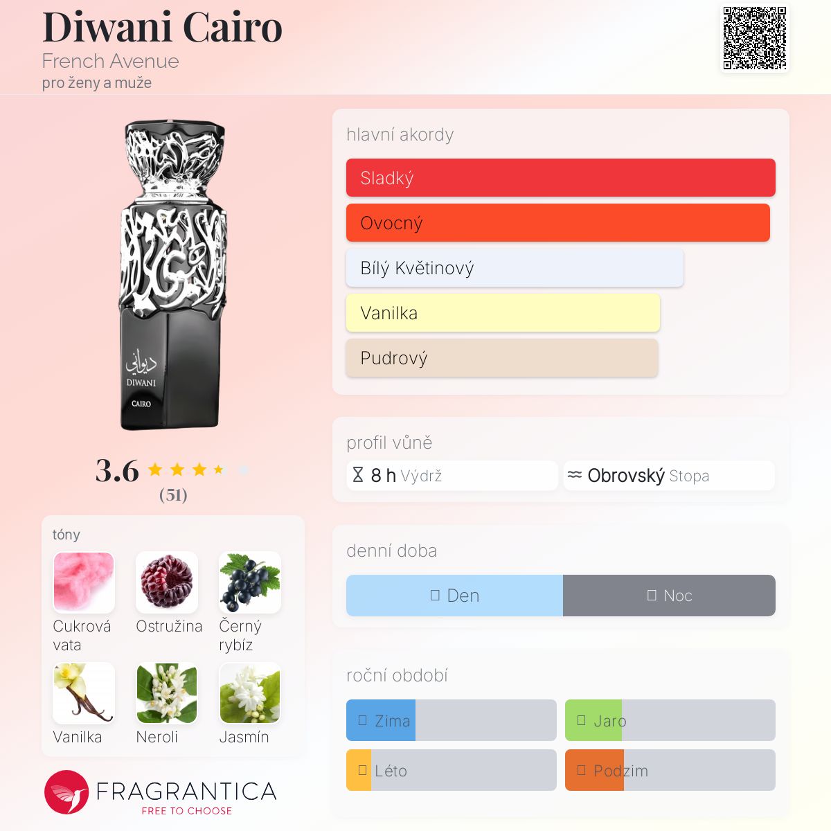 Diwani Cairo podle French Avenue je Orientální Floral vůně pro ženy a muže. Toto je nová vůně. Diwani Cairo byl/a uveden/a v roce 2024. "Nosem" za touto vůní je Jean-Louis Sieuzac. Vrchní tóny jsou Ostružina a Černý rybíz; střední tóny jsouCukrová vata, Neroli a Jasmín ; základní tóny jsou Vanilka, Jantar (ambra) a Pižmo.