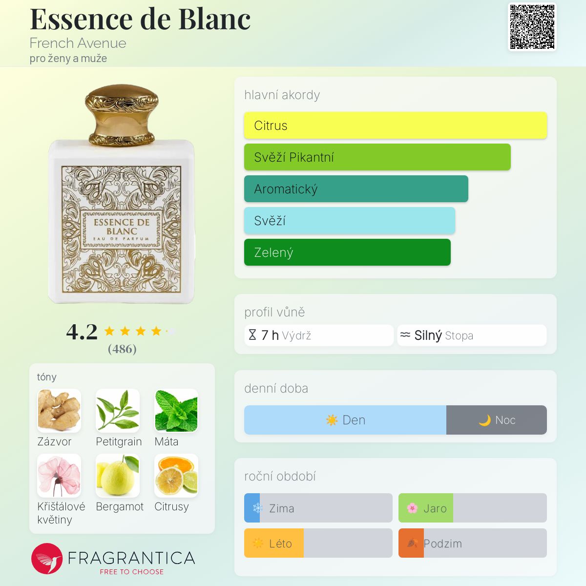 Essence de Blanc podle French Avenue je Aromatic vůně pro ženy a muže. Essence de Blanc byl/a uveden/a v roce 2022. Vrchní tóny jsou Petitgrain, Bergamot, Citrusy a Pomeranč; střední tóny jsouZázvor, Máta a Kořeněné tóny ; základní tóny jsou Křišťálové květiny, Vodní tóny a Ambra.