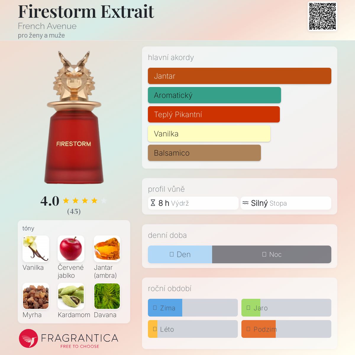 Firestorm Extrait podle French Avenue je Orientální Floral vůně pro ženy a muže. Toto je nová vůně. Firestorm Extrait byl/a uveden/a v roce 2025. Vrchní tóny jsou Červené jablko, Kardamom a Davana; střední tóny jsouOlibanum a Růže ; základní tóny jsou Vanilka, Jantar (ambra) a Myrha.