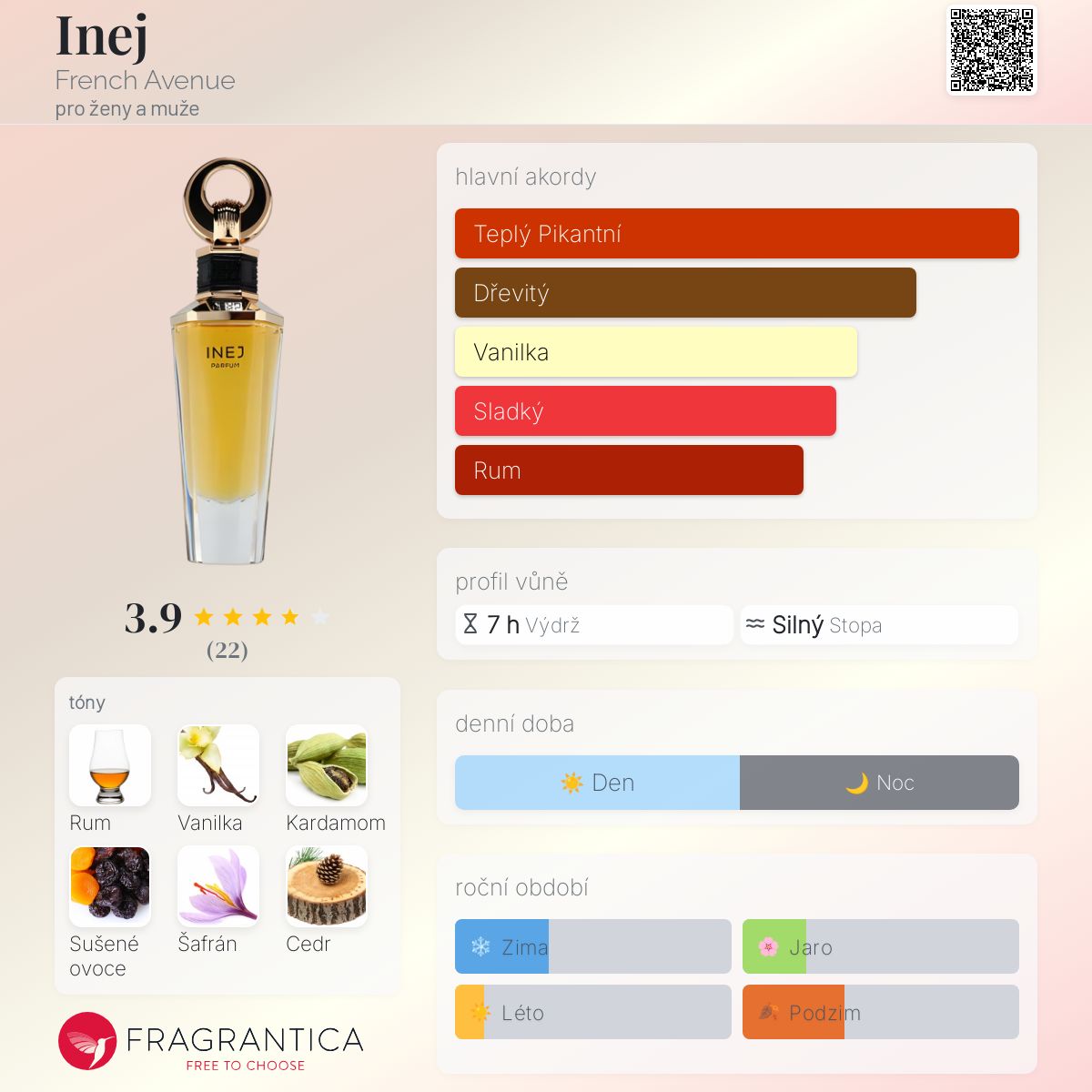 Inej podle French Avenue je Orientální Spicy vůně pro ženy a muže. Inej byl/a uveden/a v roce 2023. "Nosem" za touto vůní je Carole Calmettes. Vrchní tóny jsou Rum, Kardamom, Šafrán a Broskev; střední tóny jsouSušené ovoce, Virginský cedr, Skořice, Minerální tóny a Slaměnka ; základní tóny jsou Vanilka, Atlasový cedr, Fazole tonka, Pačuli a Labdanum.