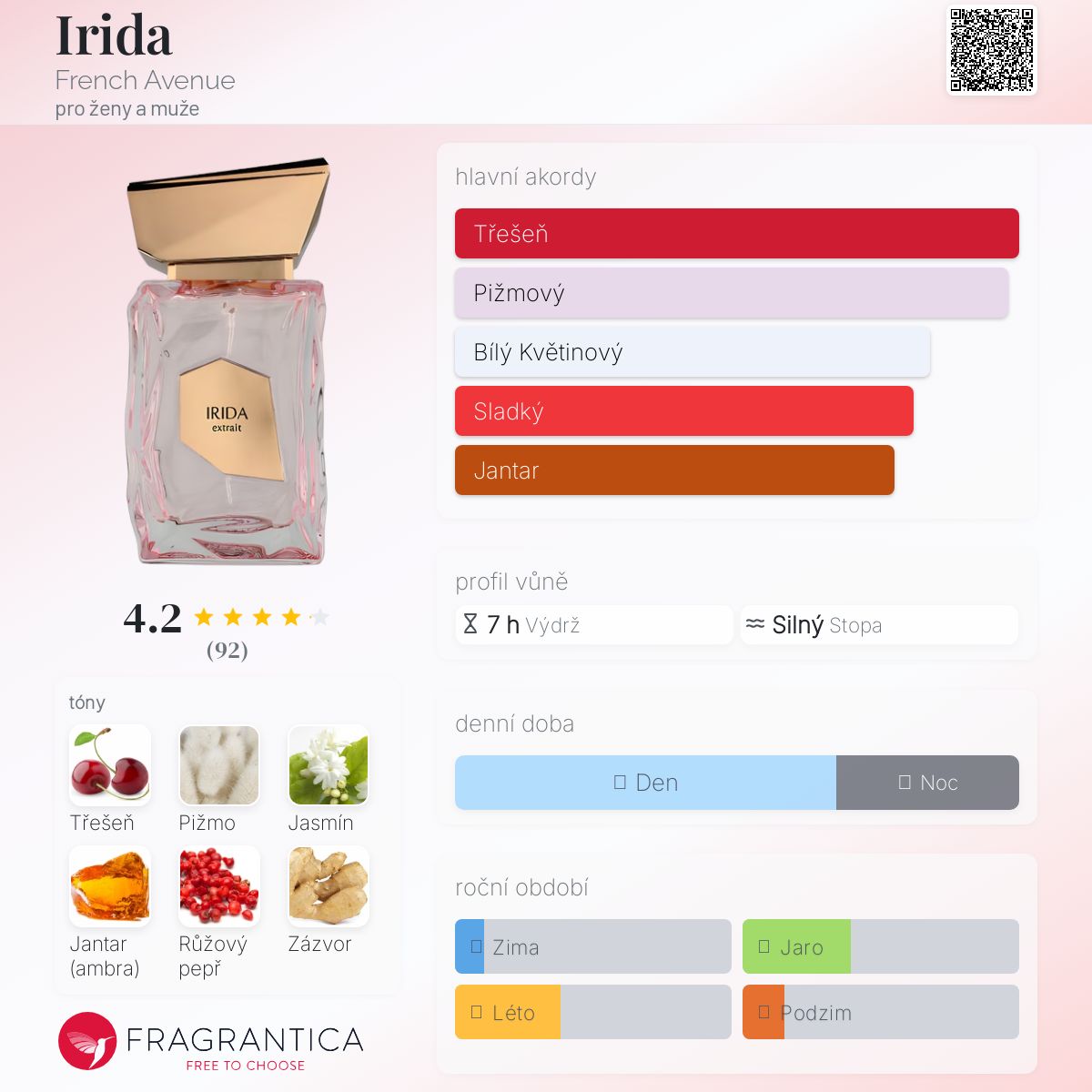 Irida podle French Avenue je vůně pro ženy a muže. Irida byl/a uveden/a v roce 2024. Vrchní tóny jsou Třešeň a Zázvor; střední tón jeJasmín ; základní tóny jsou Pižmo, Jantar (ambra) a Růžový pepř.