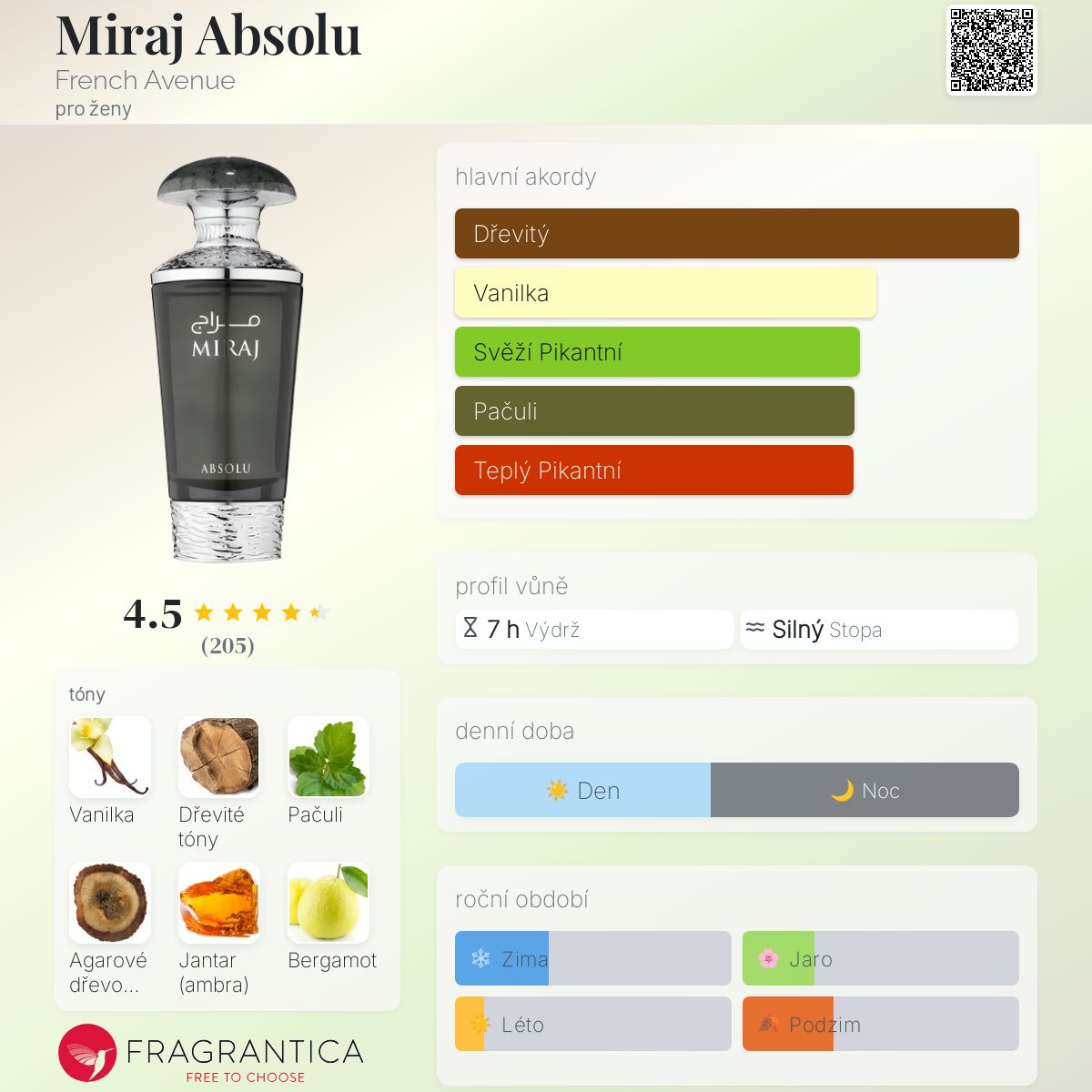 Miraj Absolu podle French Avenue je Aromatic vůně pro ženy. Toto je nová vůně. Miraj Absolu byl/a uveden/a v roce 2024. Vrchní tóny jsou Bergamot, Růžový pepř a Mandarinka; střední tóny jsouCibetka, Pelargónie, Gardénie, Růže a Leknín ; základní tóny jsou Dřevité tóny, Vanilka, Pačuli, Agarové dřevo (oud), Jantar (ambra), Dubový mech, Káva a Růžový pepř.