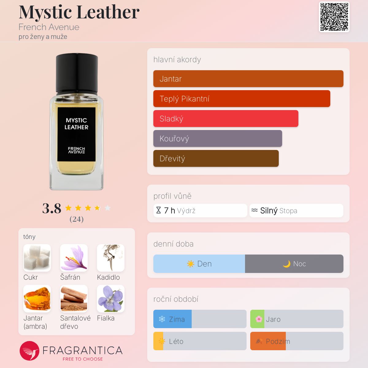 Mystic Leather podle French Avenue je vůně pro ženy a muže. Mystic Leather byl/a uveden/a v roce 2024. Vrchní tóny jsou Šafrán a Kadidlo; střední tóny jsouCukrová třtina, Jantar (ambra) a Fialka ; základní tóny jsou Santalové dřevo a Pačuli.