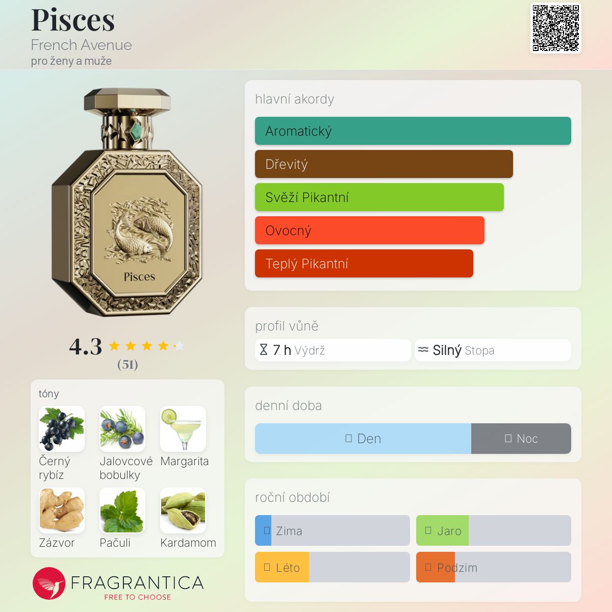 Pisces podle French Avenue je Woody Spicy vůně pro ženy a muže. Toto je nová vůně. Pisces byl/a uveden/a v roce 2025. "Nosem" za touto vůní je Shinichiro Oba. Vrchní tóny jsou Černý rybíz, Margarita a Kardamom; střední tóny jsouJalovcové bobulky a Zázvor ; základní tóny jsou Pačuli, Fazole tonka a Vetiver.
