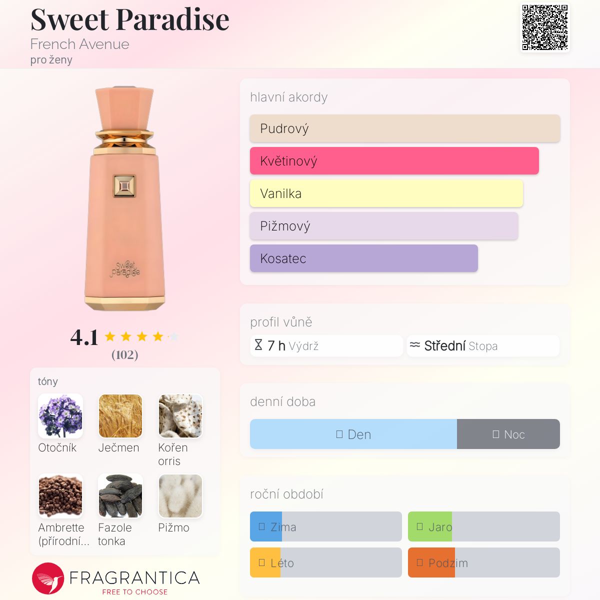 Sweet Paradise podle French Avenue je Floral Fruity vůně pro ženy. Toto je nová vůně. Sweet Paradise byl/a uveden/a v roce 2024. "Nosem" za touto vůní je Carole Calmettes. Vrchní tóny jsou Ambrette (přírodní pižmo), Pižmo a Mandarinka; střední tóny jsouOrris, Pivoňka a Broskev ; základní tóny jsou Otočník, Ječmen a Fazole tonka.