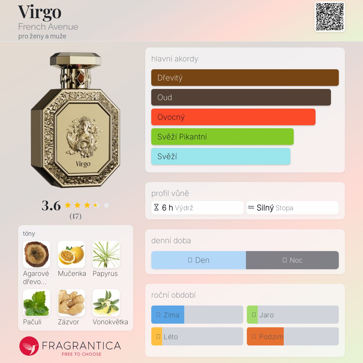 Virgo podle French Avenue je Orientální Woody vůně pro ženy a muže. Toto je nová vůně. Virgo byl/a uveden/a v roce 2025. "Nosem" za touto vůní je Amandine Galliano. Vrchní tóny jsou Mučenka, Zázvor a Bergamot; střední tóny jsouAgarové dřevo (oud), Vonokvětka a Jasmín ; základní tóny jsou Papyrus, Pačuli, Labdanum a Vetiver.
