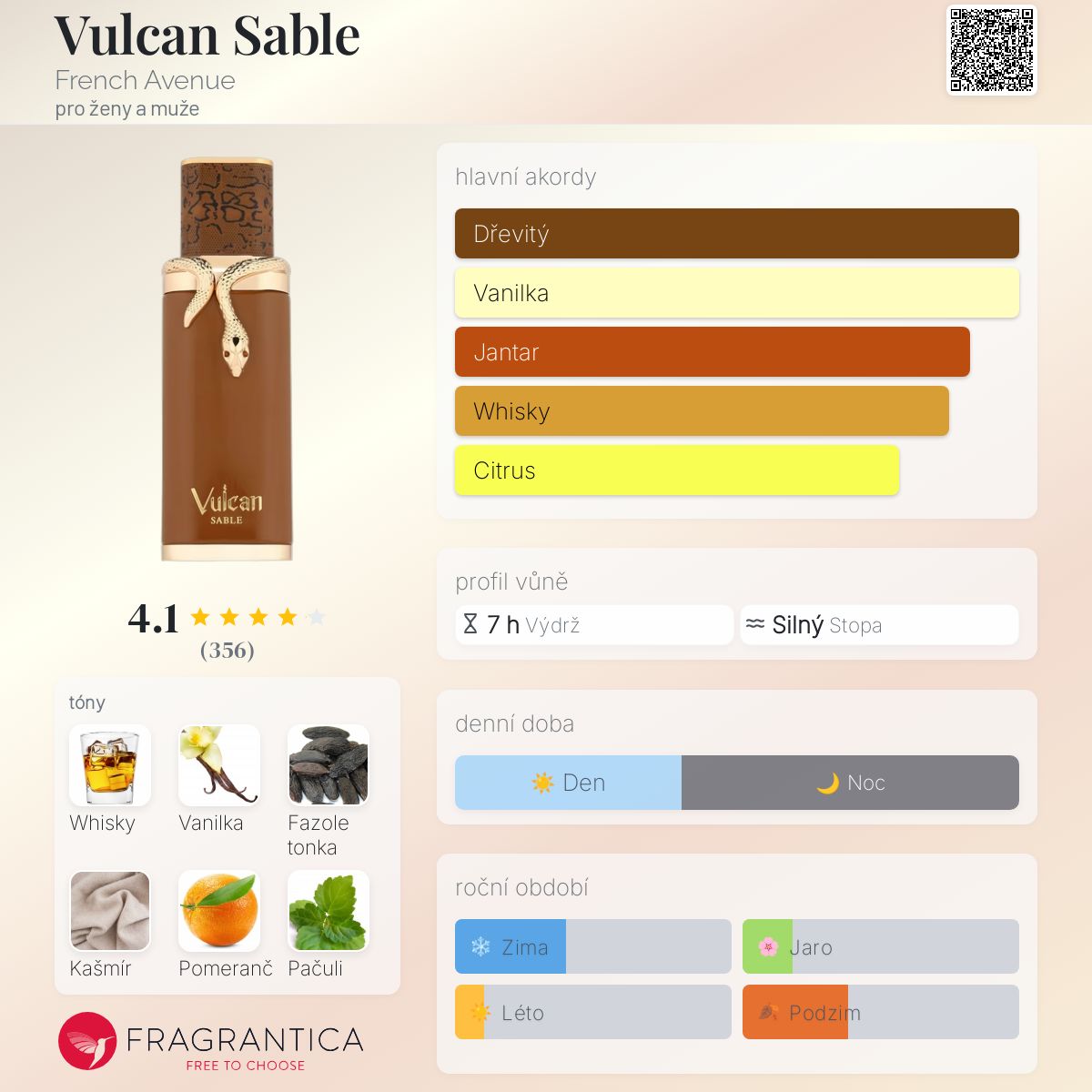 Vulcan Sable podle French Avenue je Aromatic vůně pro ženy a muže. Toto je nová vůně. Vulcan Sable byl/a uveden/a v roce 2025. Vrchní tóny jsou Whisky, Pomeranč, Mandarinka a Koriandr; střední tóny jsouFazole tonka, Kašmír, Styrax a Anýz ; základní tóny jsou Vanilka, Pačuli a Benzoin.