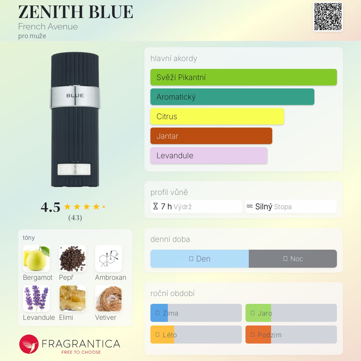 ZENITH BLUE podle French Avenue je Aromatic Fougere vůně pro muže. Toto je nová vůně. ZENITH BLUE byl/a uveden/a v roce 2025. "Nosem" za touto vůní je Jean-Louis Sieuzac. Vrchní tóny jsou Bergamot a Elimi; střední tóny jsouPepř, Levandule a Pelargónie ; základní tóny jsou Ambroxan, Vetiver a Pačuli.