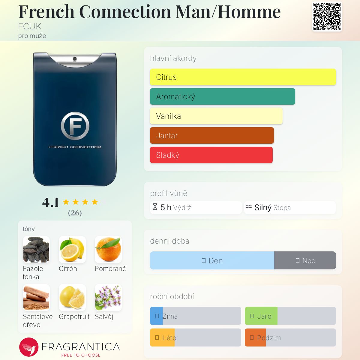 French Connection Man/Homme podle French Connection UK je Woody vůně pro muže. French Connection Man/Homme byl/a uveden/a v roce 2018. "Nosem" za touto vůní je Corinne Cachen. Vrchní tóny jsou Citrón, Pomeranč, Grapefruit a Šalvěj; střední tóny jsouSantalové dřevo, Pomerančový květ a Fialkový list ; základní tóny jsou Fazole tonka, Benzoin a Vetiver.