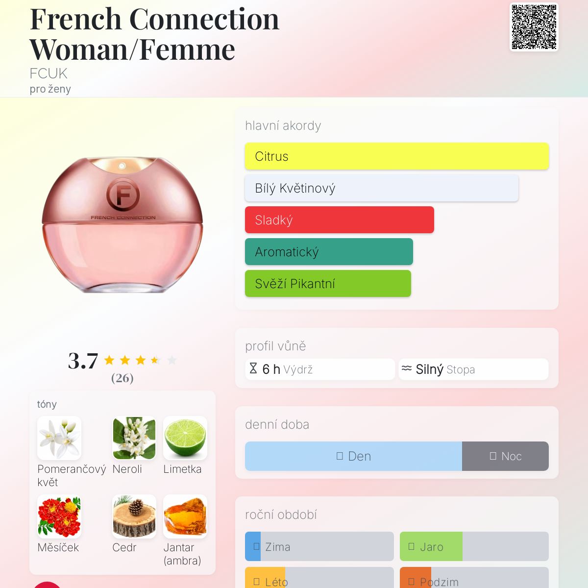 French Connection Woman/Femme podle French Connection UK je Floral Fruity vůně pro ženy. French Connection Woman/Femme byl/a uveden/a v roce 2018. "Nosem" za touto vůní je Philippe Romano. Vrchní tóny jsou Limetka, Mandarinka a Granny Smith jablko; střední tóny jsouPomerančový květ, Neroli a Aksamitník ; základní tóny jsou Extrakt z bílého cedru, Křišťálový jantar a Pižmo.