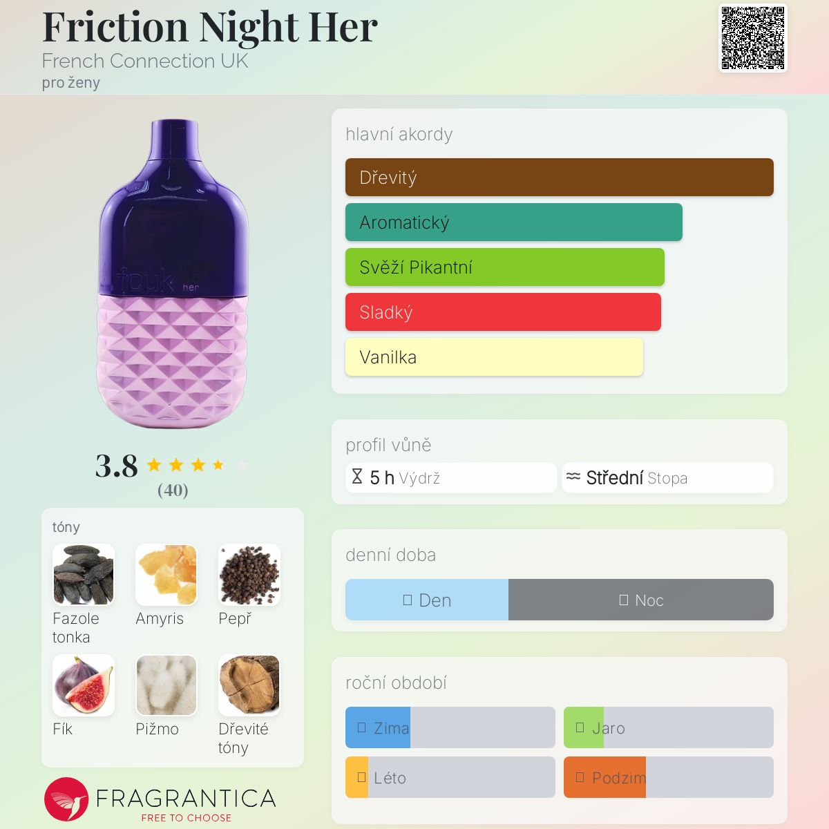 Friction Night Her podle French Connection UK je Citrus vůně pro ženy. Friction Night Her byl/a uveden/a v roce 2020. Vrchní tóny jsou Amyris, Pepř a Bergamot; střední tóny jsouFík, Jasmín a Neroli ; základní tóny jsou Fazole tonka, Pižmo a Dřevité tóny.