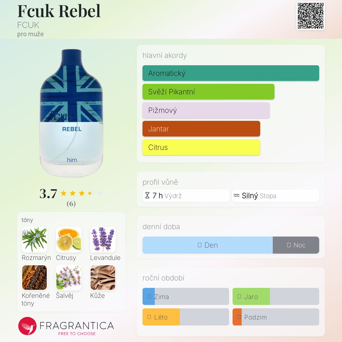 Rebel podle French Connection UK je Woody Aromatic vůně pro muže. Rebel byl/a uveden/a v roce 2020. Vrchní tóny jsou Rozmarýn a Citrusy; střední tóny jsouLevandule, Koření a Šalvěj ; základní tóny jsou Kůže, Jantar (ambra) a Pižmo.