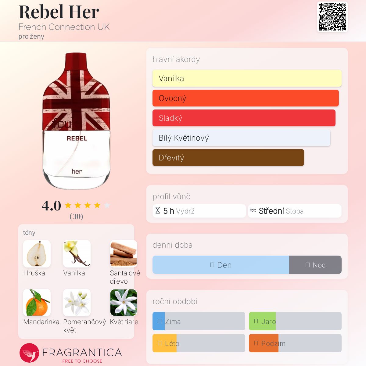 Rebel Her podle French Connection UK je Floral Fruity vůně pro ženy. Rebel Her byl/a uveden/a v roce 2020. Vrchní tóny jsou Hruška, Mandarinka a Pomerančový květ; střední tóny jsouKvět tiare, Jasmín a Růže ; základní tóny jsou Vanilka, Santalové dřevo a Vetiver.