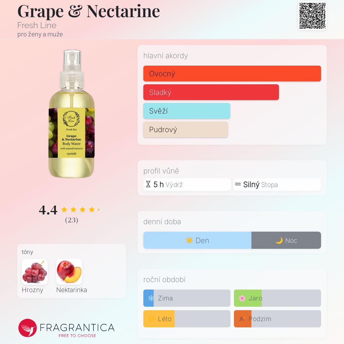 Grape & Nectarine podle Fresh Line je Aromatic Fruity vůně pro ženy a muže. Grape & Nectarine byl/a uveden/a v roce 2018.