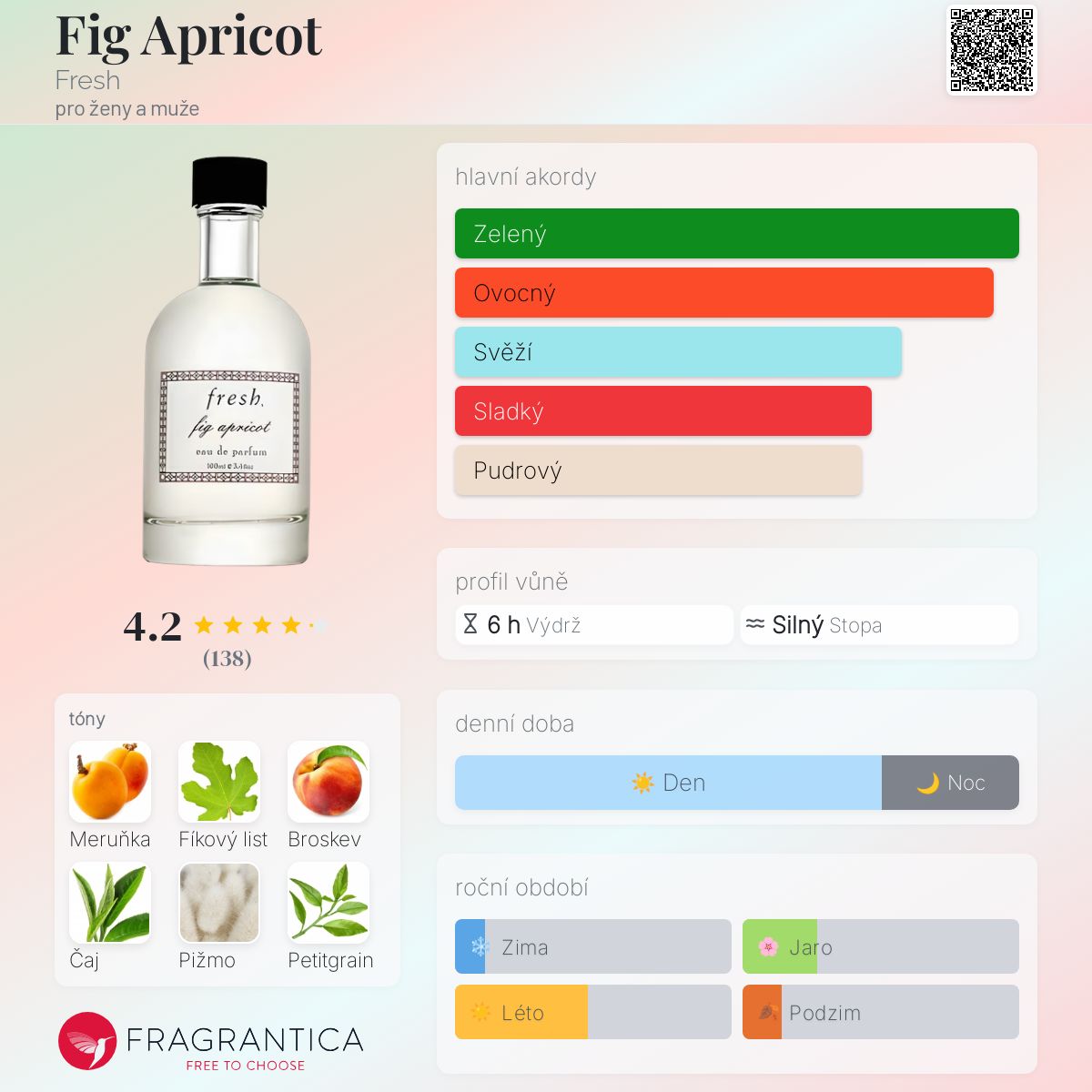 Fig Apricot podle Fresh je Floral Fruity vůně pro ženy a muže. Fig Apricot byl/a uveden/a v roce 2008. Vrchní tóny jsou Meruňka, Broskev a Liči; střední tóny jsouFíkový list, Petitgrain a Pampeliška ; základní tóny jsou Zelený čaj, Pižmo a Mořská voda.