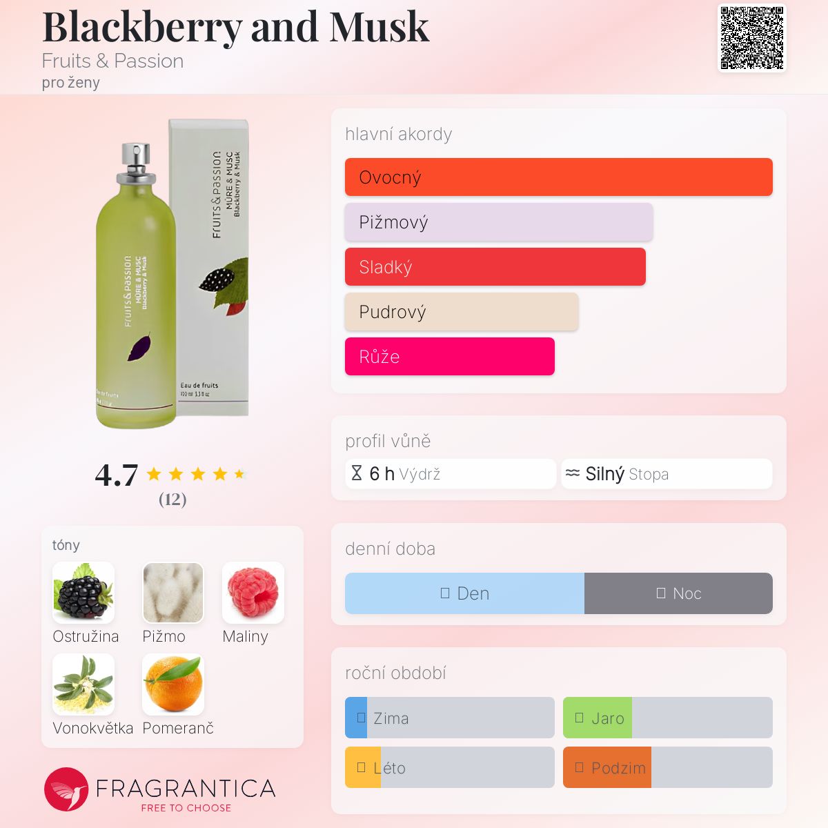 Blackberry and Musk podle Fruits & Passion je Floral Fruity vůně pro ženy. Blackberry and Musk byla spuštěna během 2000. Vrchní tóny jsou Ostružina a Pomeranč; střední tóny jsouMaliny a Vonokvětka ; základní tón je Pižmo.