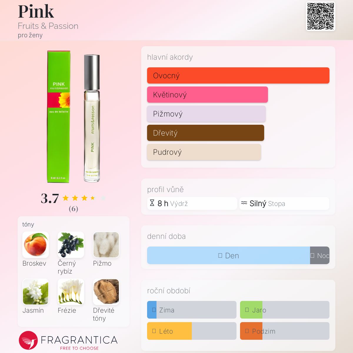 Pink podle Fruits & Passion je Floral Fruity vůně pro ženy. Vrchní tóny jsou Broskev a Černý rybíz; střední tóny jsouJasmín a Frézie ; základní tóny jsou Pižmo a Dřevité tóny.