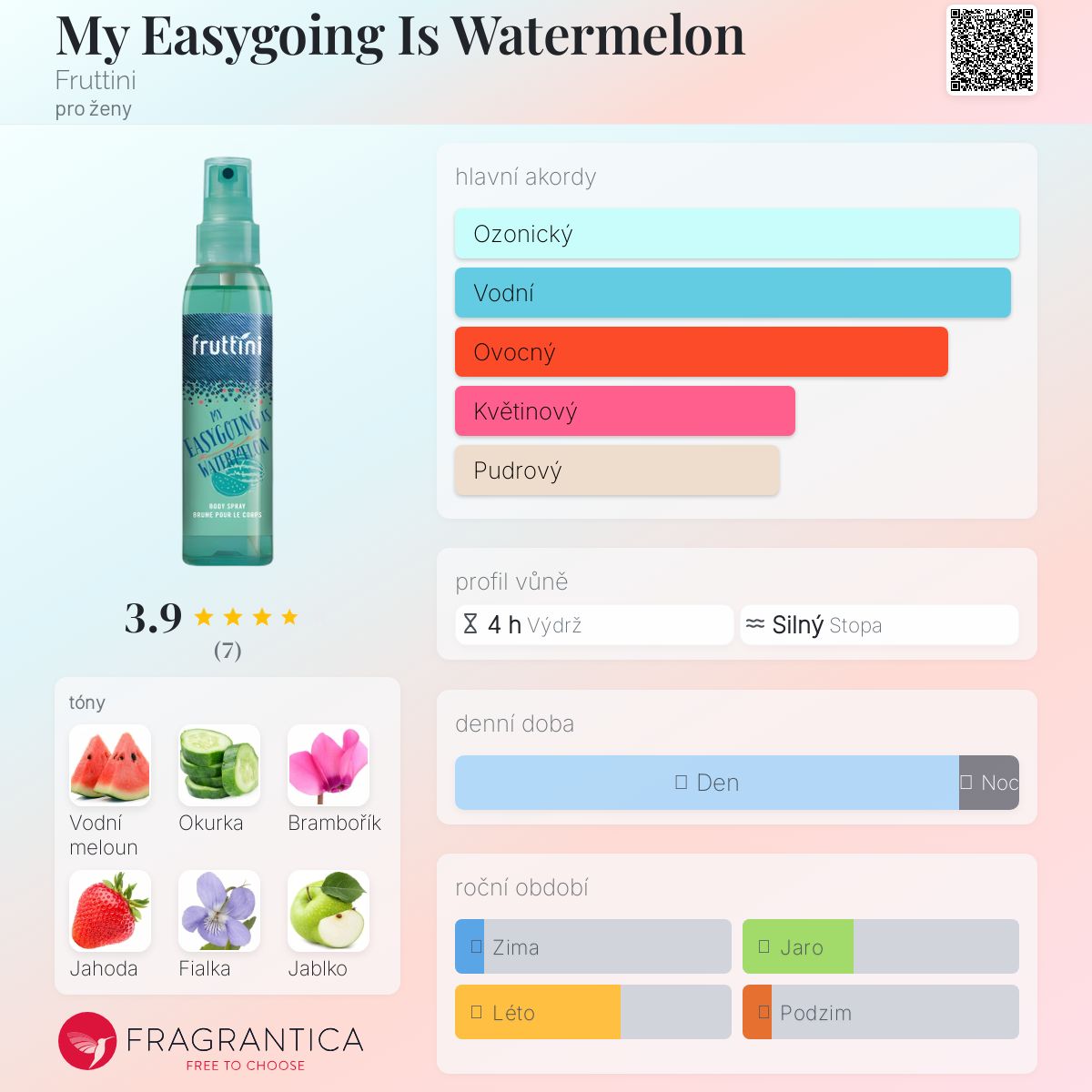 My Easygoing Is Watermelon podle Fruttini je Floral Fruity vůně pro ženy. My Easygoing Is Watermelon byl/a uveden/a v roce 2015. Vrchní tóny jsou Vodní meloun, Okurka a Jablko; střední tóny jsouBrambořík, Jahoda, Broskev, Frézie, Liči a Rebarbora ; základní tóny jsou Fialka, Cedr a Pižmo.