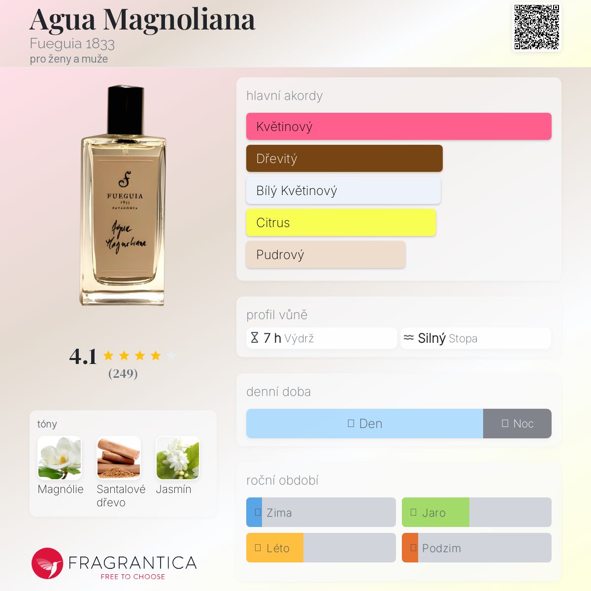 Agua Magnoliana podle Fueguia 1833 je Floral vůně pro ženy a muže. Agua Magnoliana byl/a uveden/a v roce 2010. "Nosem" za touto vůní je Julian Bedel. Vrchní tón je Magnólie ; střední tón jeJasmín ; základní tón je Santalové dřevo.