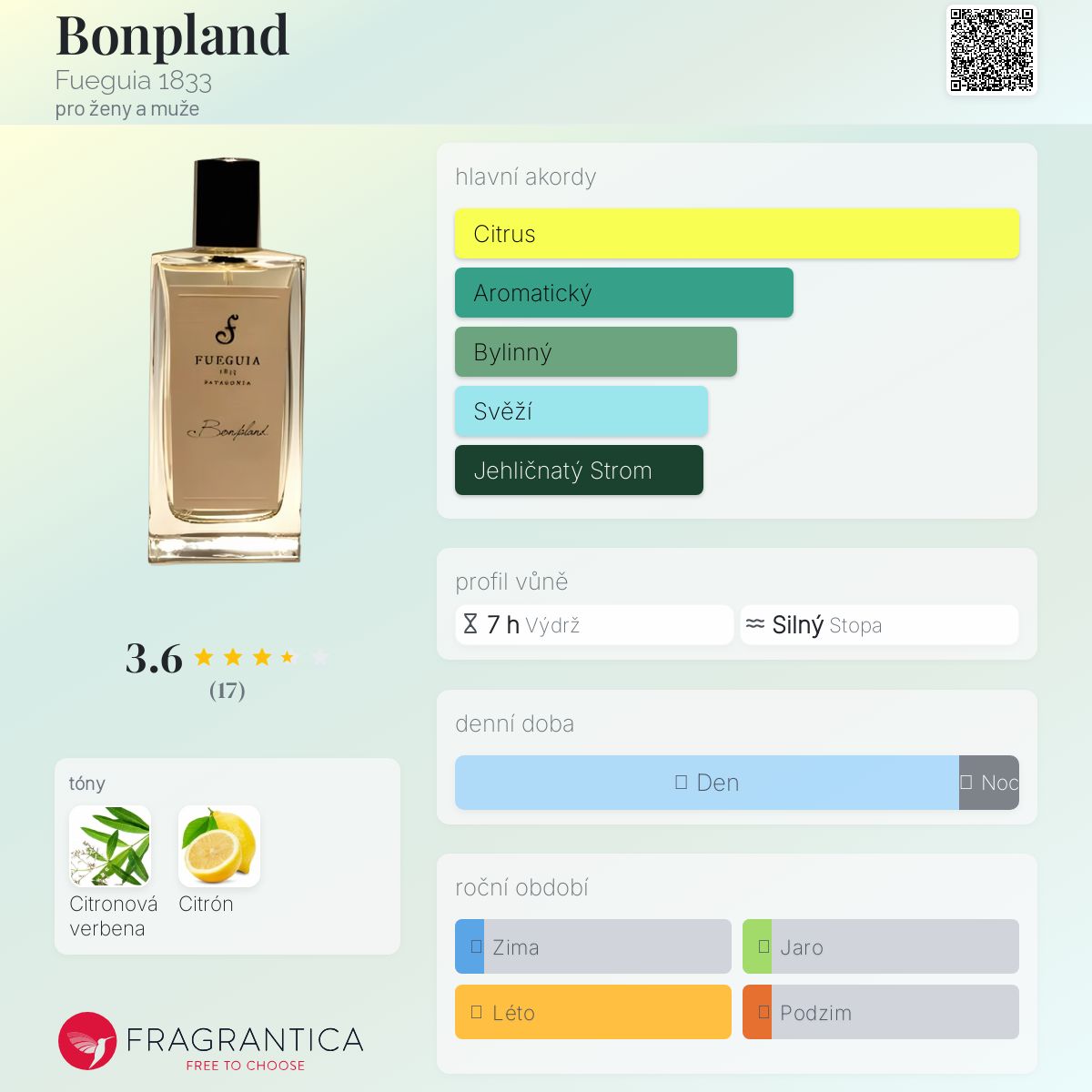 Bonpland podle Fueguia 1833 je Citrus Aromatic vůně pro ženy a muže. Bonpland byl/a uveden/a v roce 2010. "Nosem" za touto vůní je Julian Bedel. střední tón jeCitronová verbena ; základní tón je Citrón.