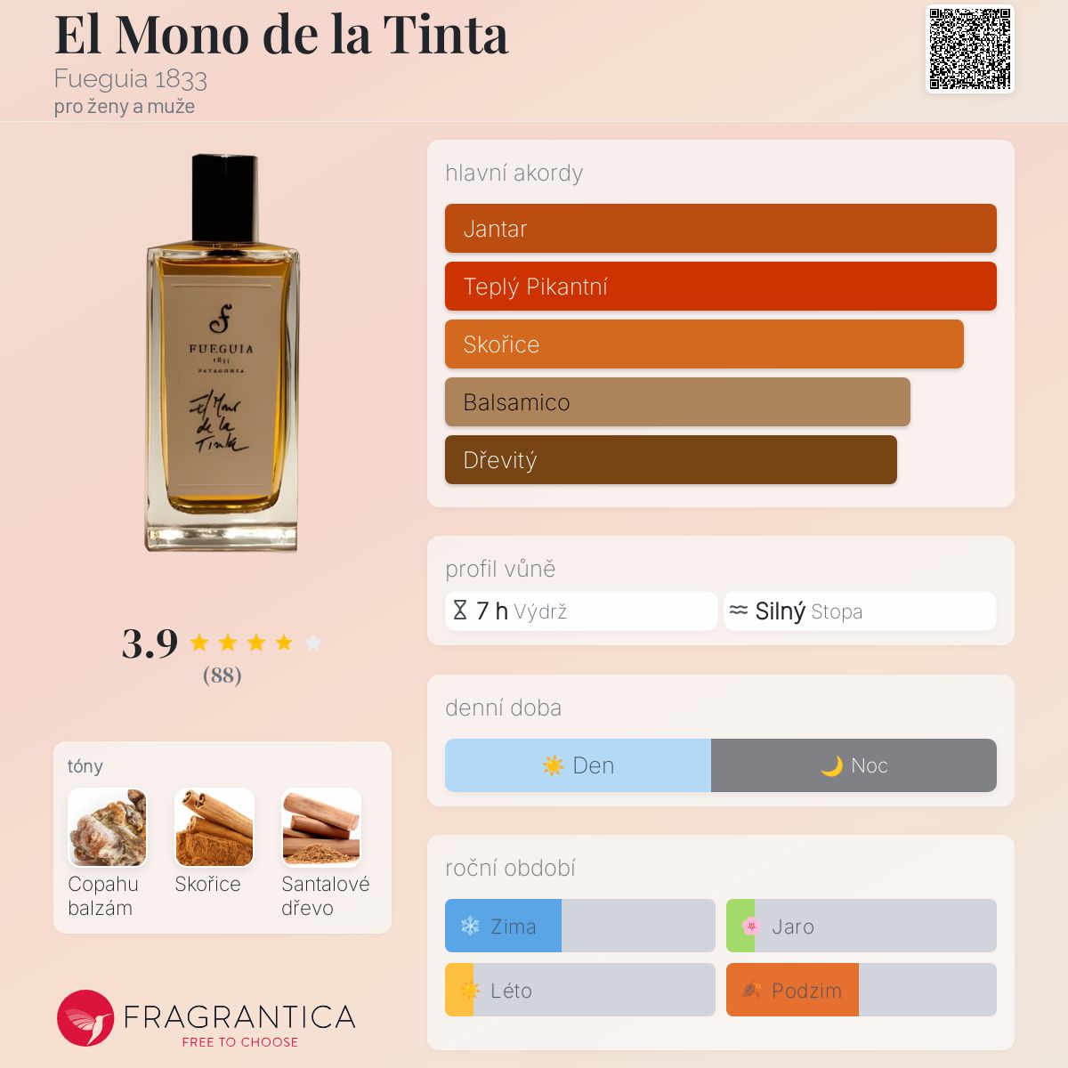 El Mono de la Tinta podle Fueguia 1833 je Orientální Woody vůně pro ženy a muže. El Mono de la Tinta byl/a uveden/a v roce 2010. "Nosem" za touto vůní je Julian Bedel. Vrchní tón je Copahu balzám ; střední tón jeSantalové dřevo ; základní tón je Skořice.