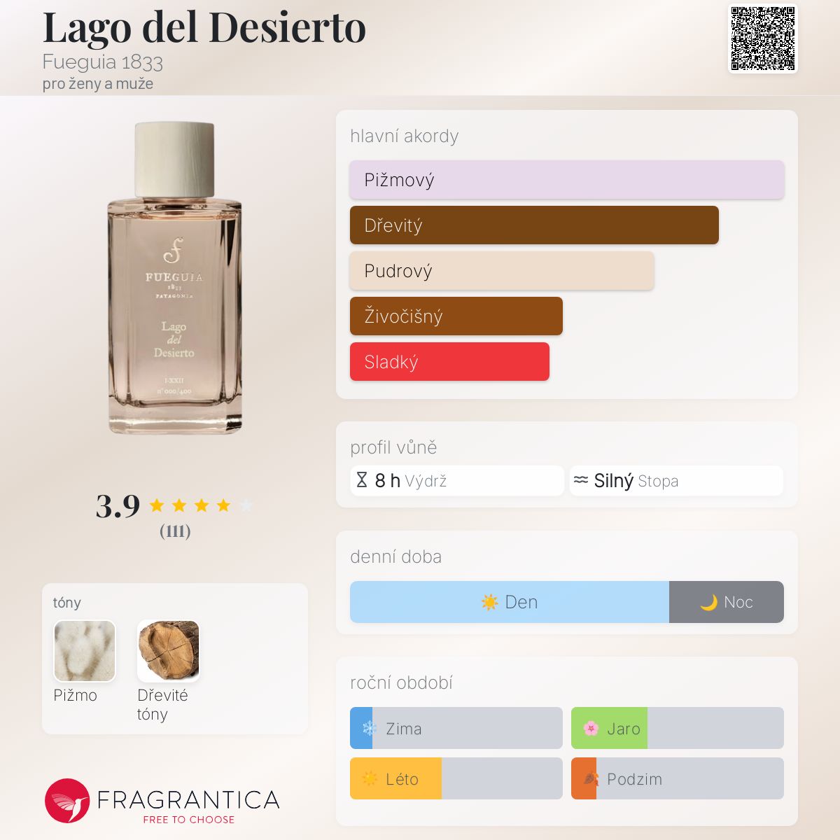 Lago del Desierto podle Fueguia 1833 je Woody Aquatic vůně pro ženy a muže. Lago del Desierto byl/a uveden/a v roce 2010. "Nosem" za touto vůní je Julian Bedel. Vrchní tón je Pižmo ; střední tón jeDřevité tóny ; základní tón je Dřevité tóny.
