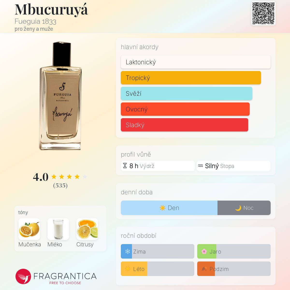 Mbucuruyá podle Fueguia 1833 je Floral Fruity Gourmand vůně pro ženy a muže. Mbucuruyá byl/a uveden/a v roce 2010. "Nosem" za touto vůní je Julian Bedel. Vrchní tón je Mučenka ; střední tón jeCitrusy ; základní tón je Mléko.
