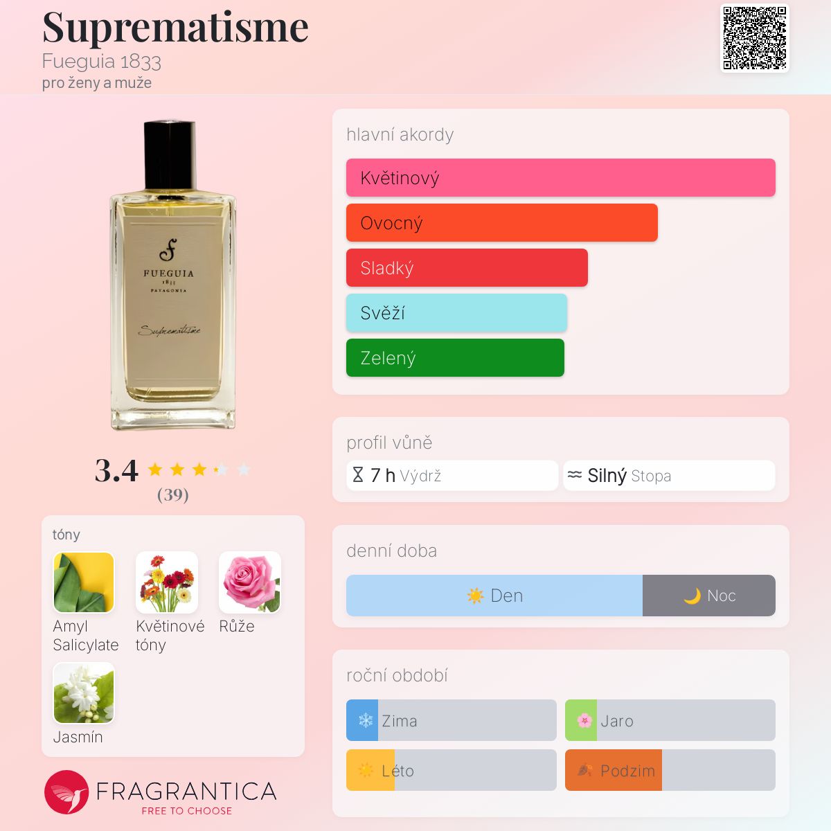 Suprematisme podle Fueguia 1833 je Floral vůně pro ženy a muže. Suprematisme byl/a uveden/a v roce 2014. "Nosem" za touto vůní je Julian Bedel.