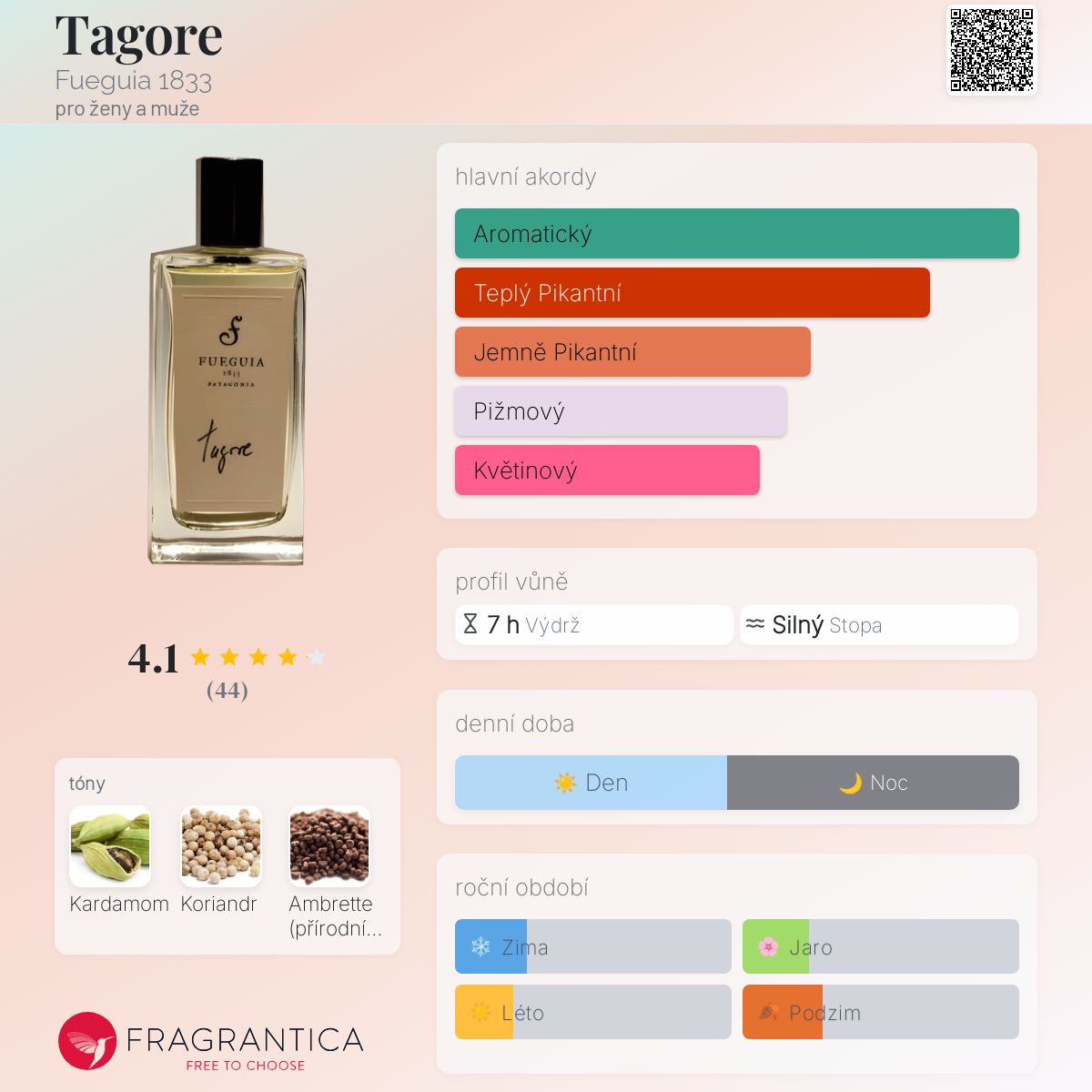 Tagore podle Fueguia 1833 je Aromatic Spicy vůně pro ženy a muže. Tagore byl/a uveden/a v roce 2010. "Nosem" za touto vůní je Julian Bedel. Vrchní tón je Kardamom ; střední tón jeAmbrette (přírodní pižmo) ; základní tón je Koriandr.