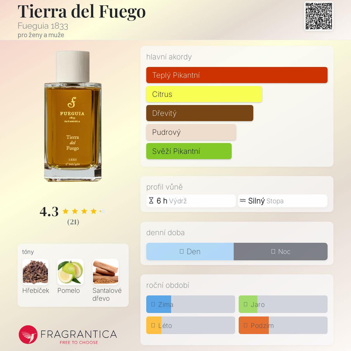 Tierra del Fuego podle Fueguia 1833 je Aromatic Spicy vůně pro ženy a muže. Tierra del Fuego byl/a uveden/a v roce 2014. "Nosem" za touto vůní je Julian Bedel. Vrchní tón je Hřebíček ; střední tón jeSantalové dřevo ; základní tón je Pomelo.