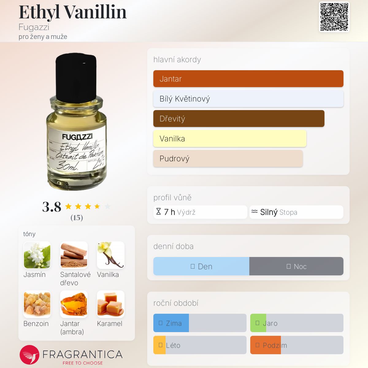 Ethyl Vanillin podle Fugazzi je Orientální Vanilla vůně pro ženy a muže. Toto je nová vůně. Ethyl Vanillin byl/a uveden/a v roce 2025. Vrchní tóny jsou Jasmín a Karamel; střední tóny jsouVanilka a Benzoin ; základní tóny jsou Santalové dřevo a Jantar (ambra).