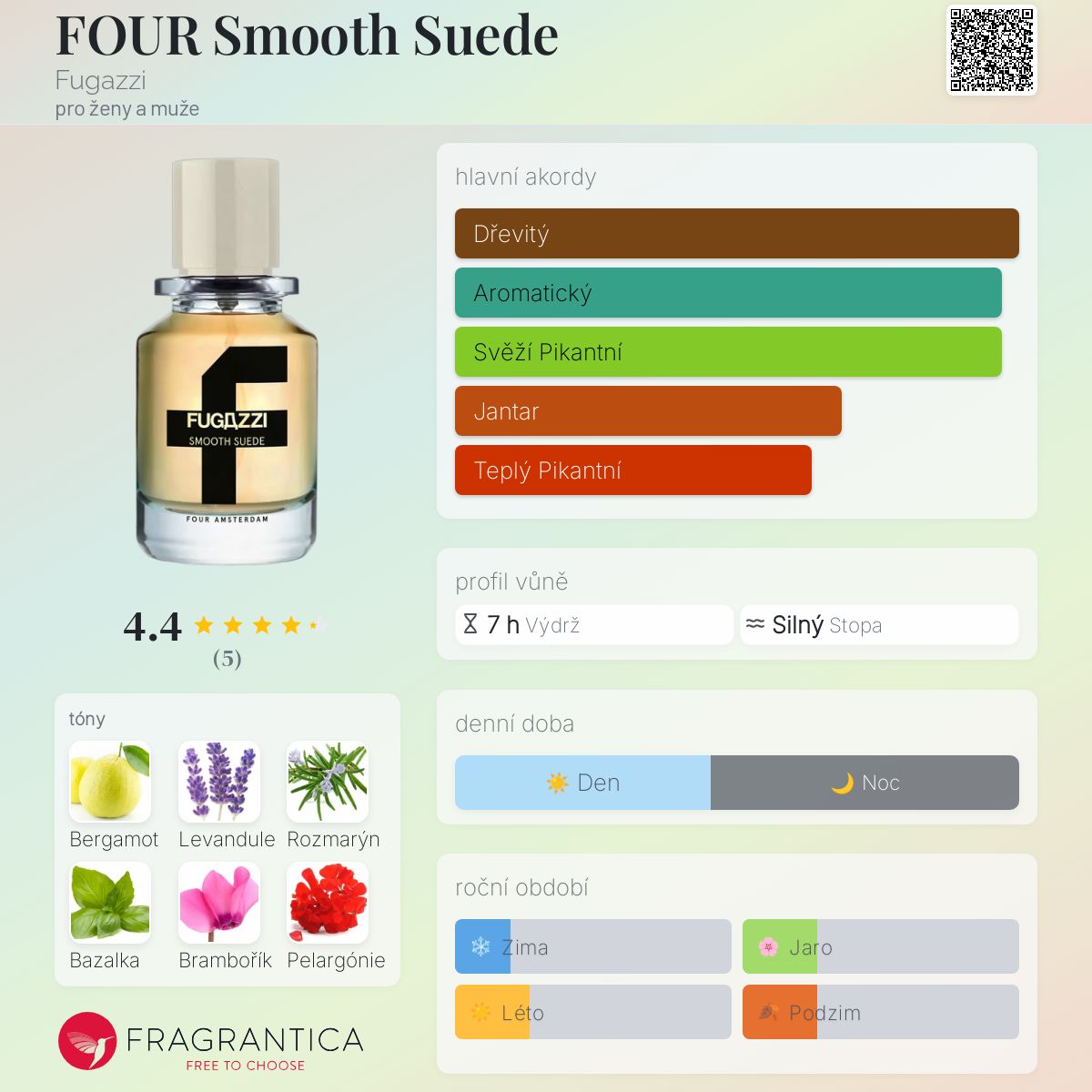 FOUR Smooth Suede podle Fugazzi je Orientální Woody vůně pro ženy a muže. FOUR Smooth Suede byl/a uveden/a v roce 2022. Vrchní tóny jsou Kalábrijský bergamot, Levandule a Rozmarýn; střední tóny jsouBazalka, Brambořík, Pelargónie, Palisandr a Semiš ; základní tóny jsou Jantar (ambra), Dub, Agarové dřevo (oud), Pačuli, Santalové dřevo a Fazole tonka.