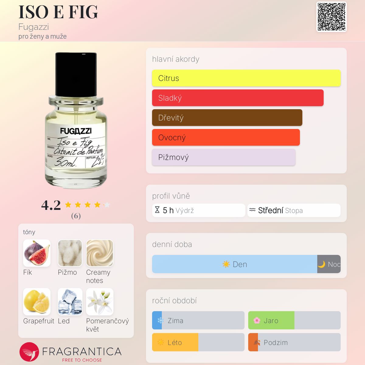 ISO E FIG podle Fugazzi je Floral Fruity vůně pro ženy a muže. Toto je nová vůně. ISO E FIG byl/a uveden/a v roce 2025. Vrchní tóny jsou Fík, Grapefruit, Led a Pomeranč; střední tóny jsouFík, Bílé pižmo, Creamy notes a Pomerančový květ ; základní tóny jsou Fíkovník, Santalové dřevo a Jantar (ambra).